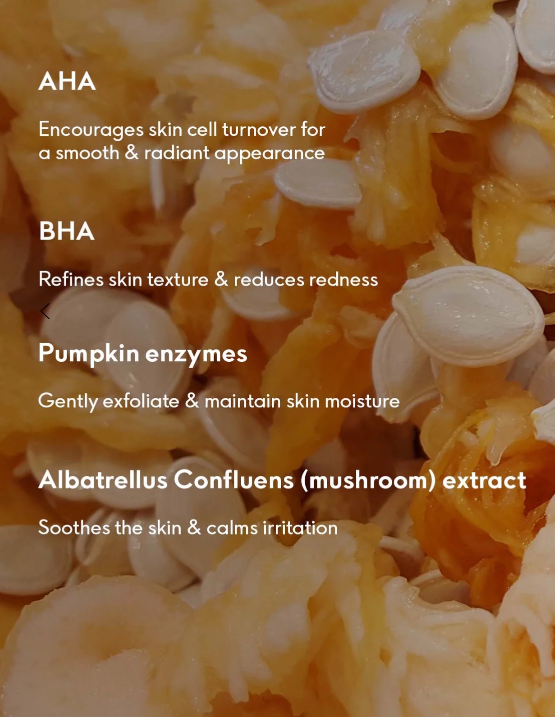A highly effective complex of active ingredients consisting of AHA, BHA, and pumpkin enzymes—in a total concentration of 10%—gently removes dead skin cells and works optimally with soothing Phellinus linteus mushroom extract. Unlike many exfoliants, the lotion is not rinsed off but remains on the skin, where it takes effect.