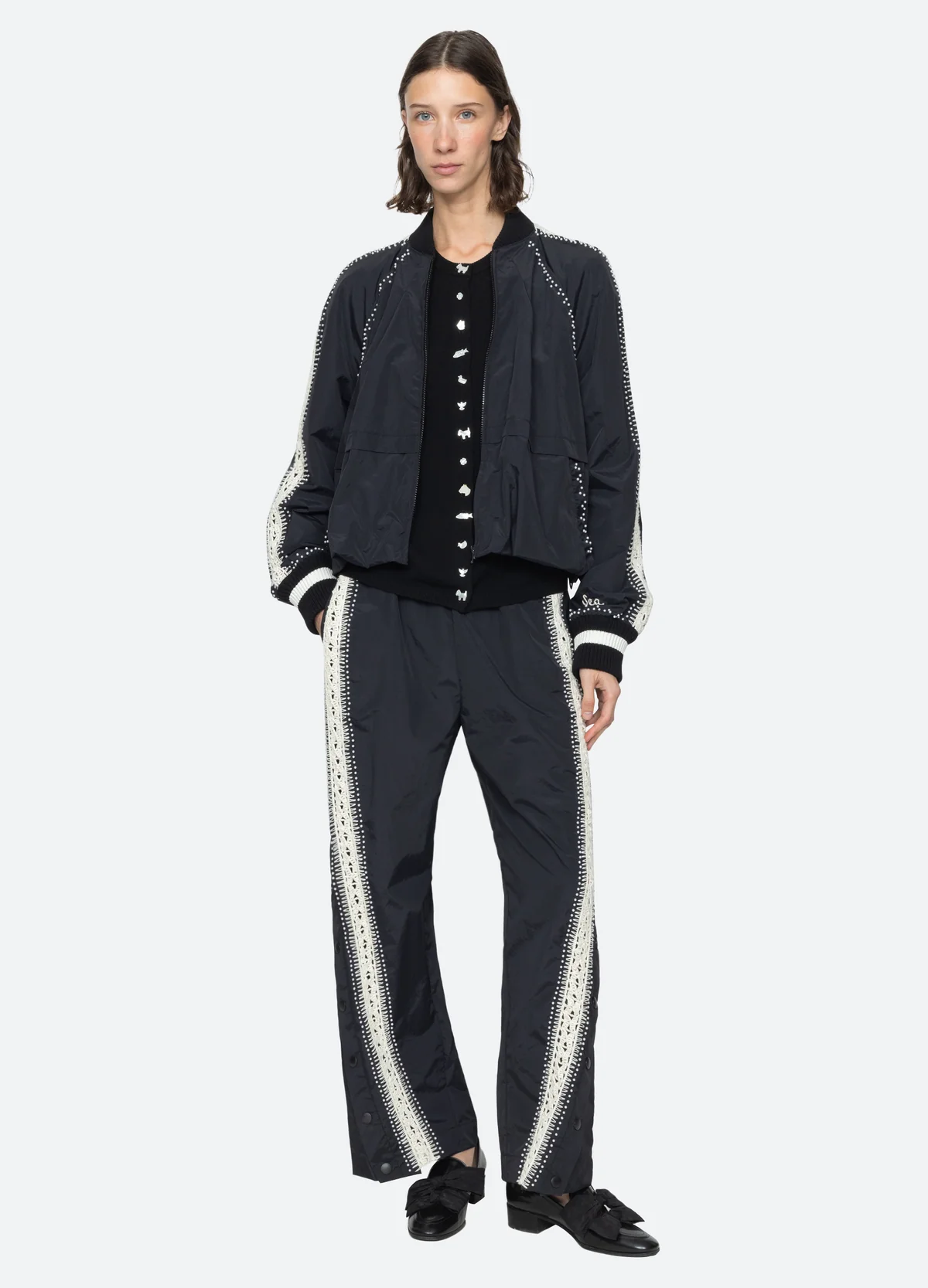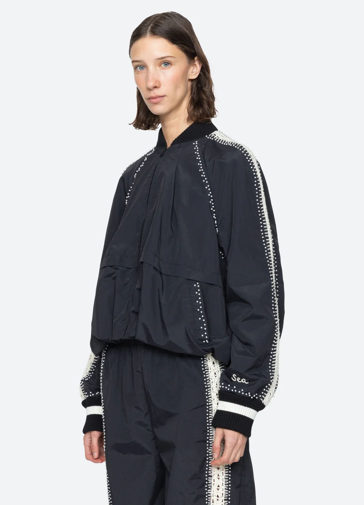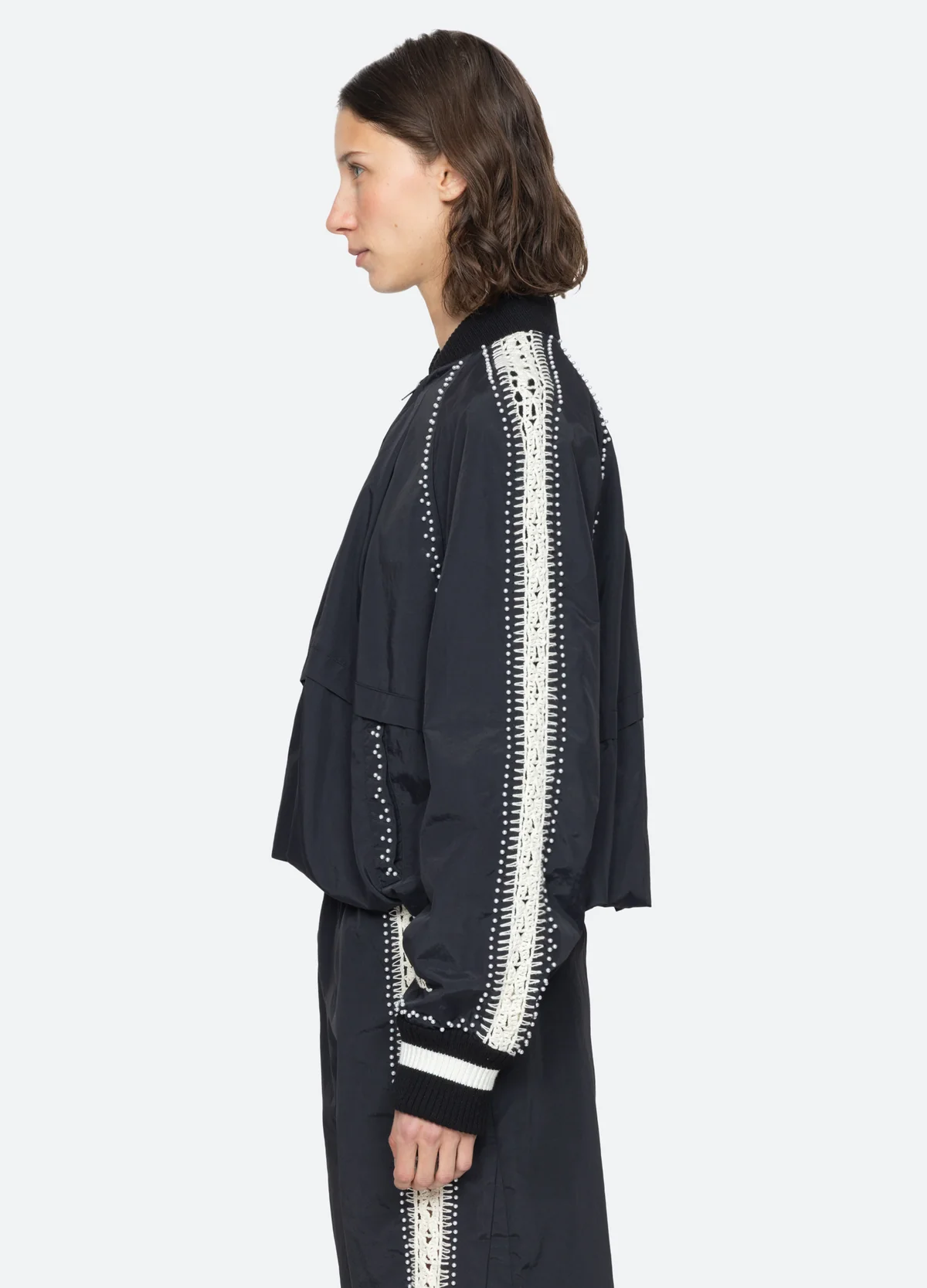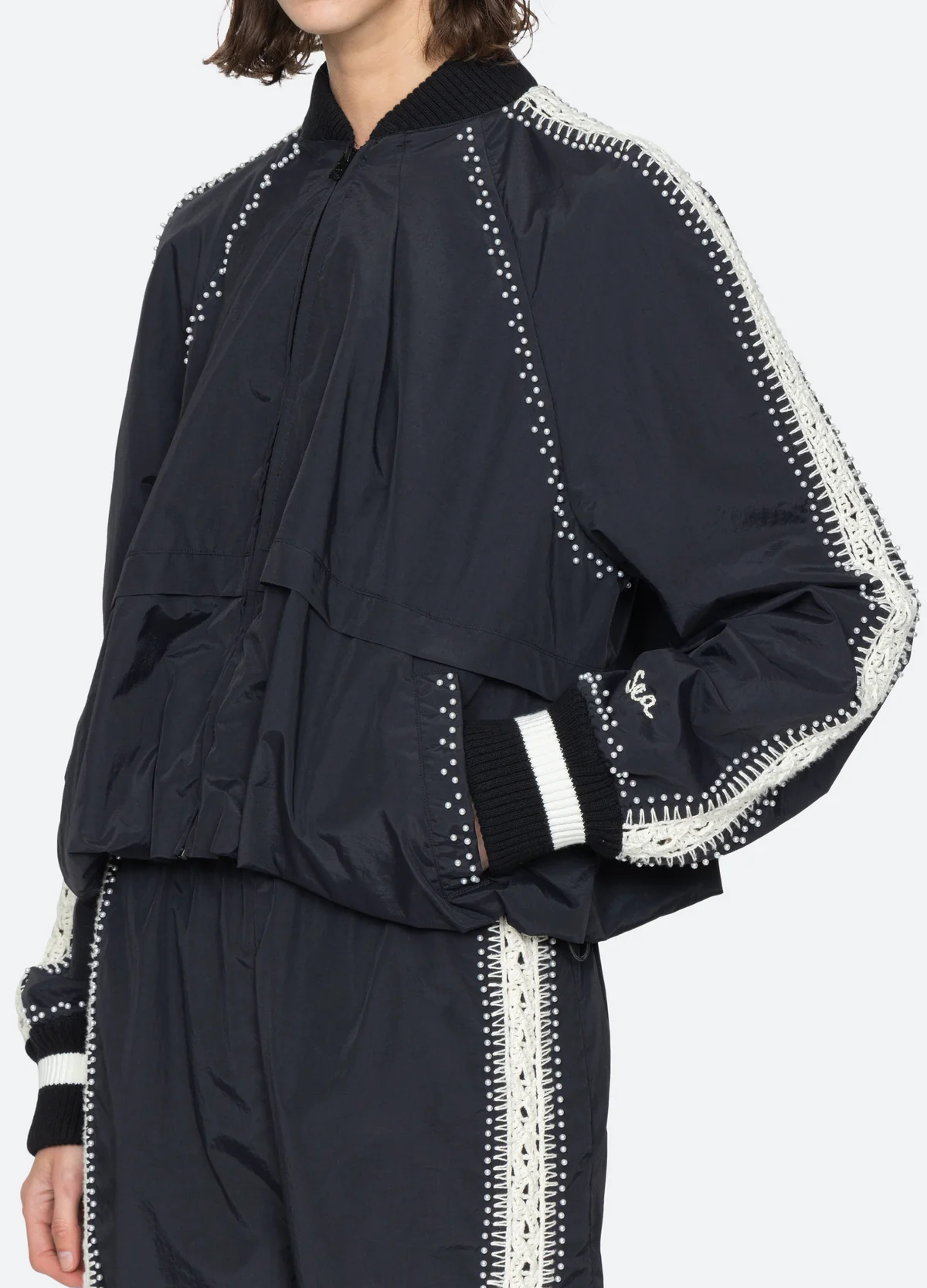 The Alberta windbreaker jacket is thoughtfully detailed with hand-crocheted trim and delicate pearl accents throughout. This unexpected pairing of utility and craft adds a refined, feminine touch to the lightweight silhouette.