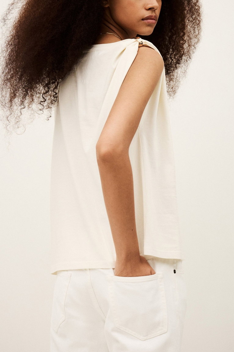 T-Shirt with detachable golden detail on one shoulder.