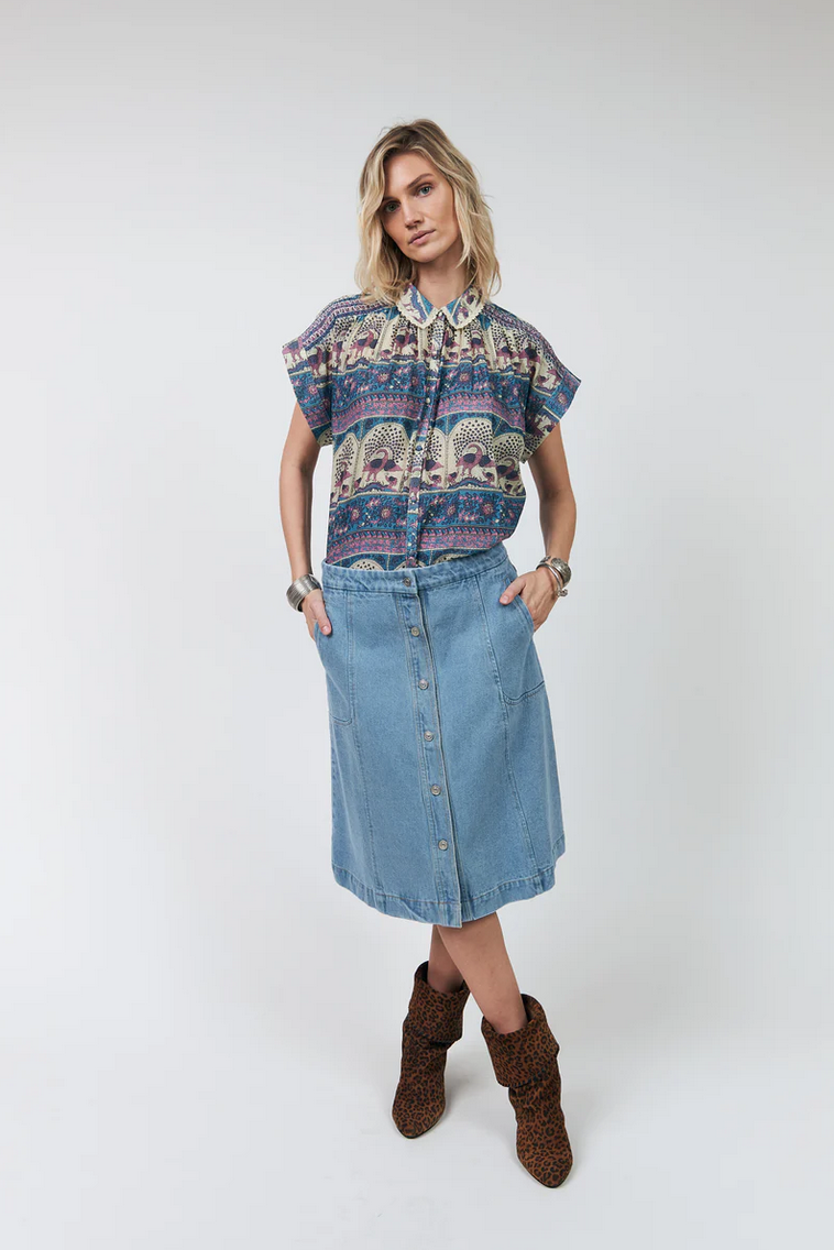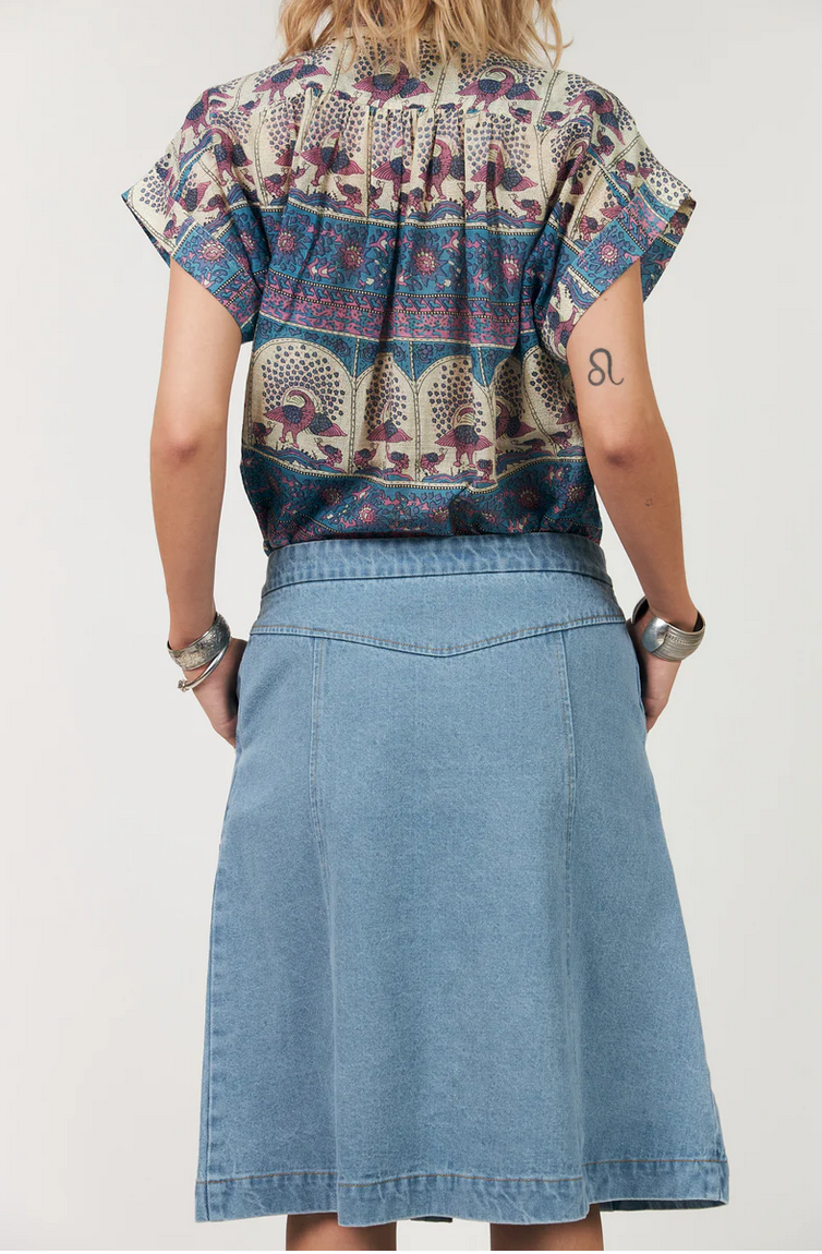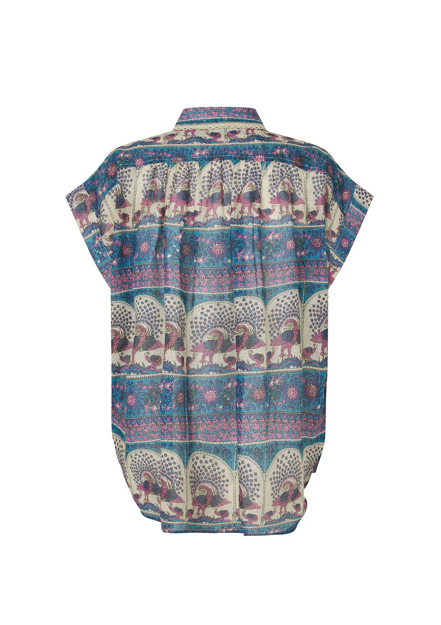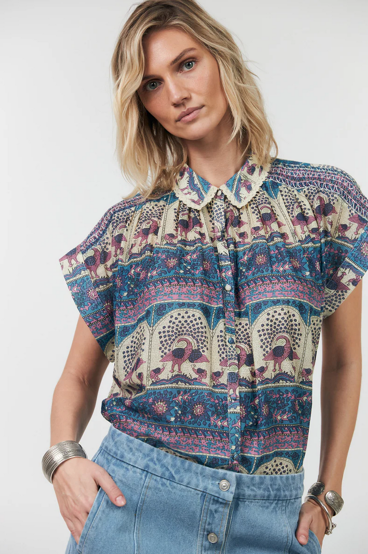 Badal shirt is a feminine shirt in an ultra light quality featuring an artistic print full of delicate details. The print combines ornamental borders and illustrated bird motifs in soft blue and pink tones. It features decorative smock details across the shoulders and beautiful lace details on the collar. The shirt is styled beautifully with the Myra skirt for a complete look.