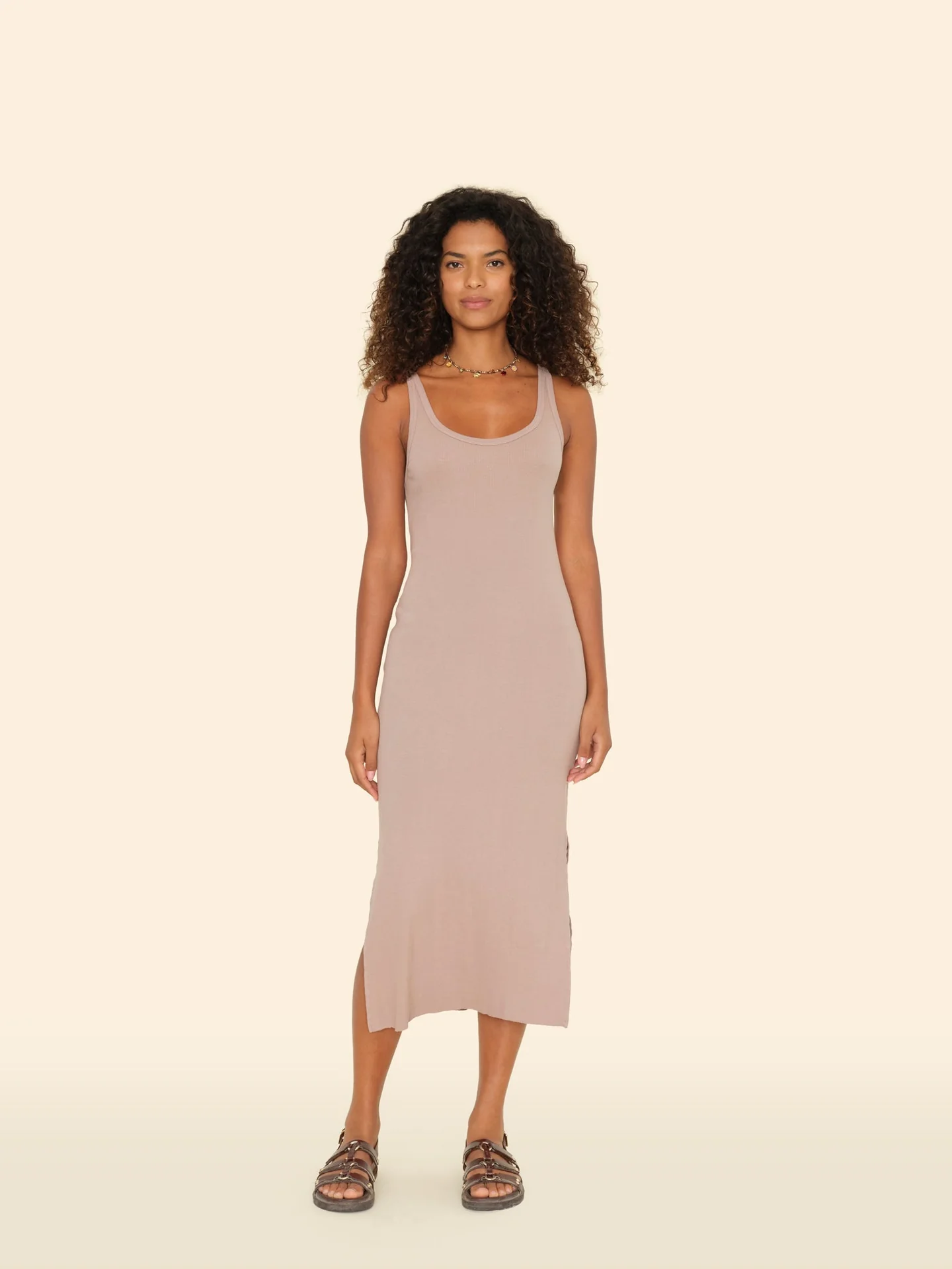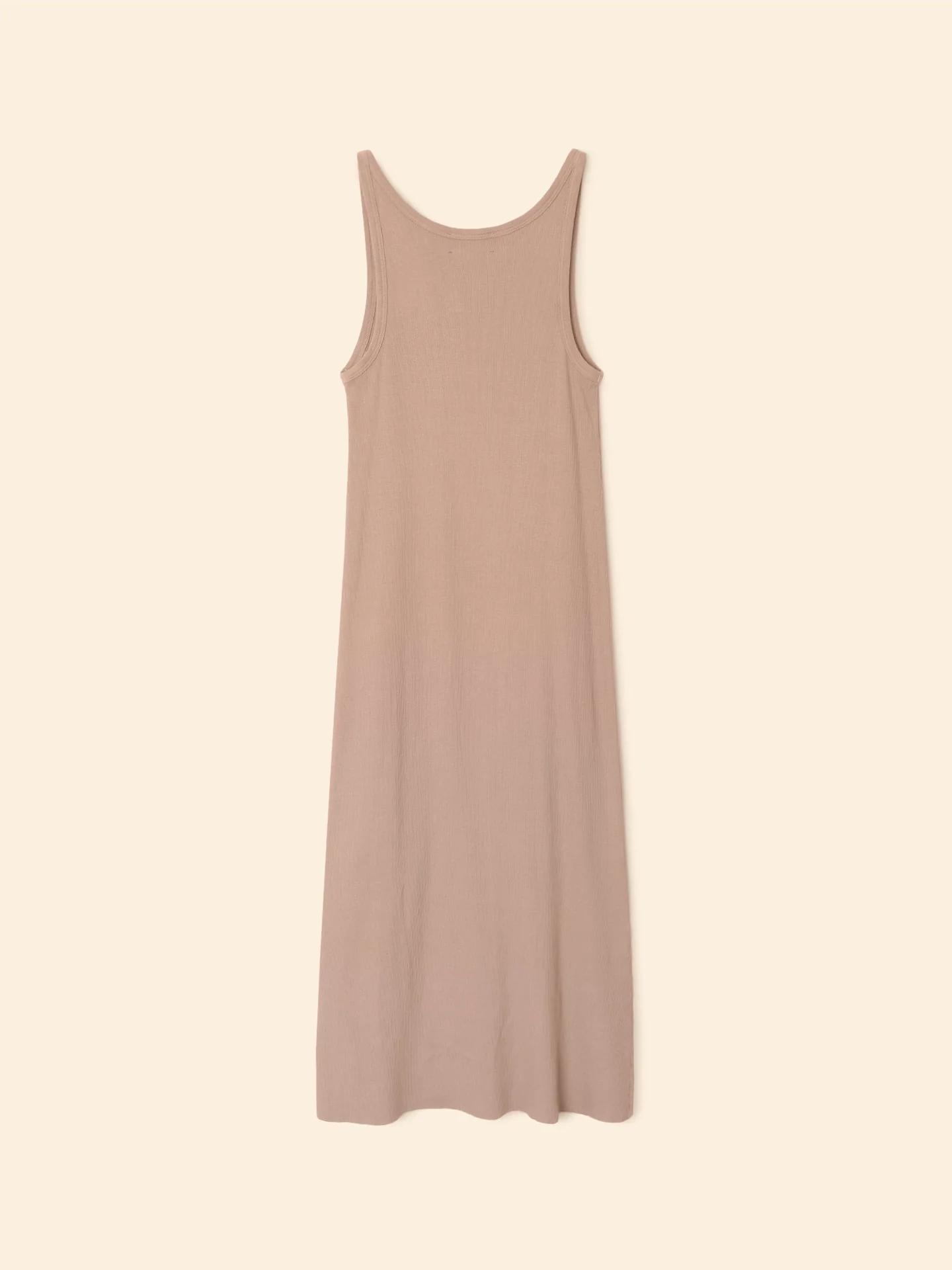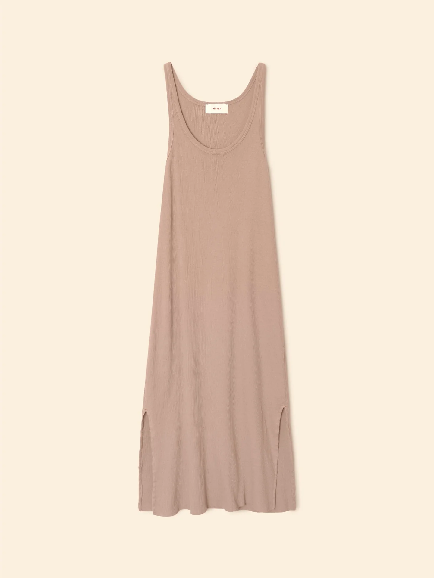 Back to Basics. Beckett is new this season in our fine cotton rib knit. This sleeveless column dress is maxi length and features a deep scoop neck, double binding straps, and hem side slits.