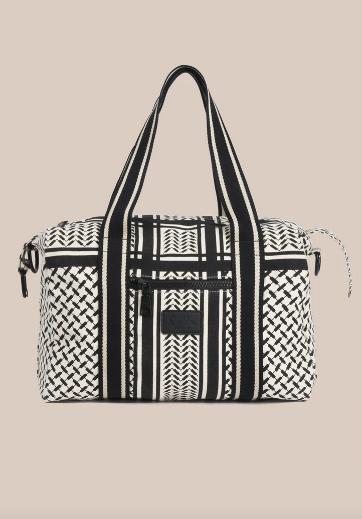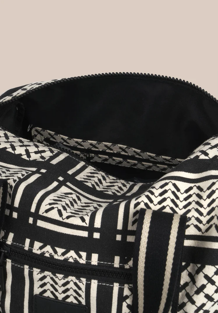 A spacious weekender made of off-white canvas with a black Kufiya print, finished off with a detachable and contrasting shoulder strap, fine detailing and a lala Berlin logo in the front. Removable and adjustable shoulder strap.Extra straps on the sides to vary size of bag. Small inside pocket that closes with a zipper.