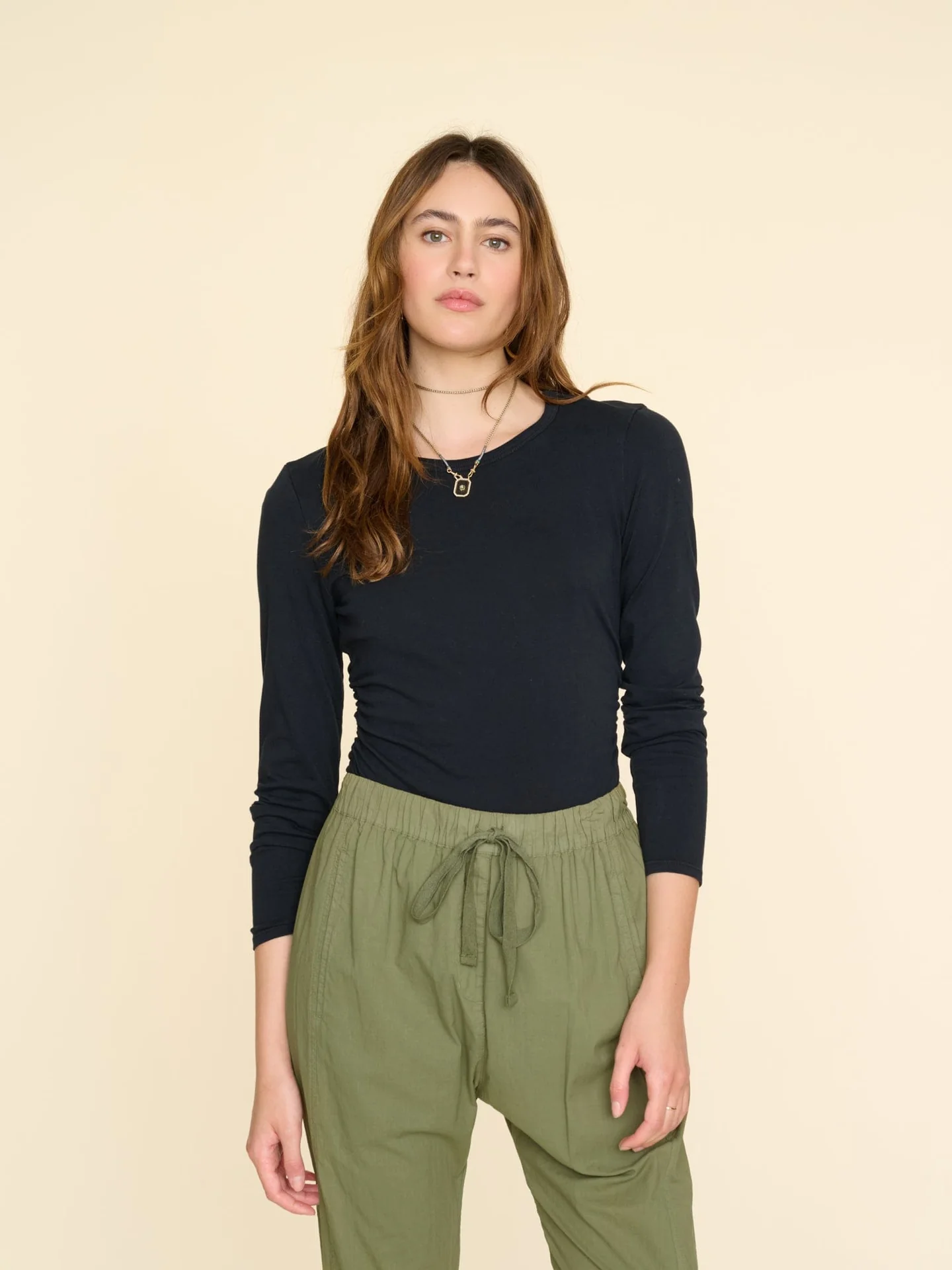 Back to Basics. Frankie is made in a mid-weight cotton jersey for a soft and cozy feel. Frankie is long-sleeve crew neck tee with an elastic ruched waist.