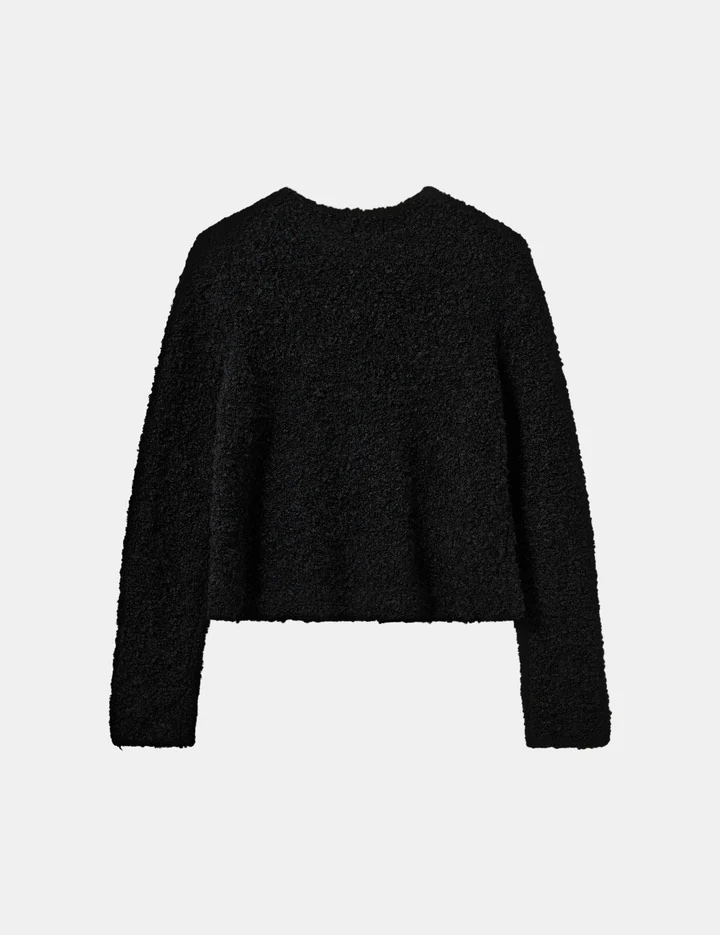 A vintage inspired cardigan style jacket, made from a super soft and cozy bouclé fabric. This playful style is easy to wear for casual or more dressy occasion. The embellished button details elevate the look of the piece and add an extra elegant touch.