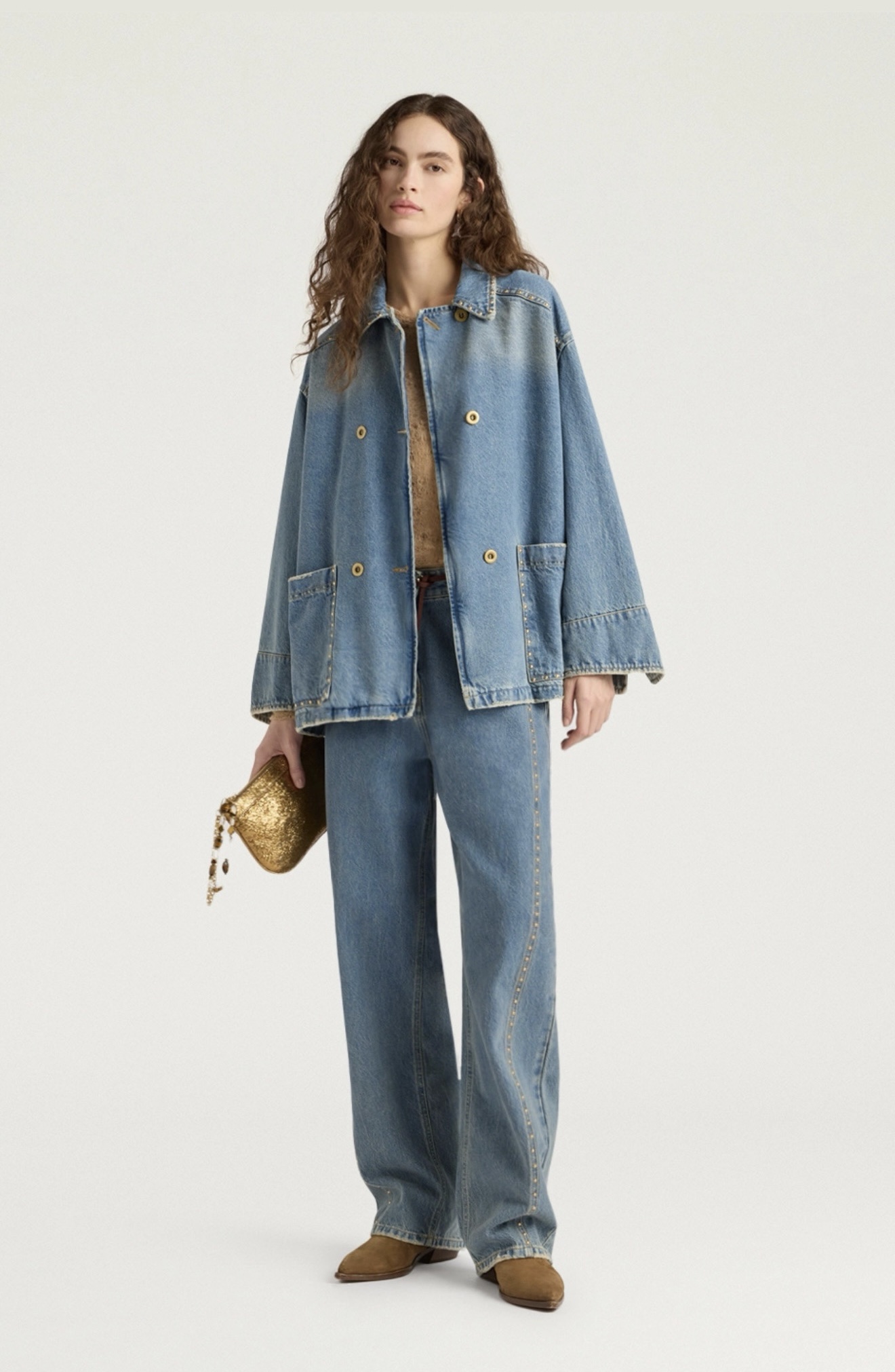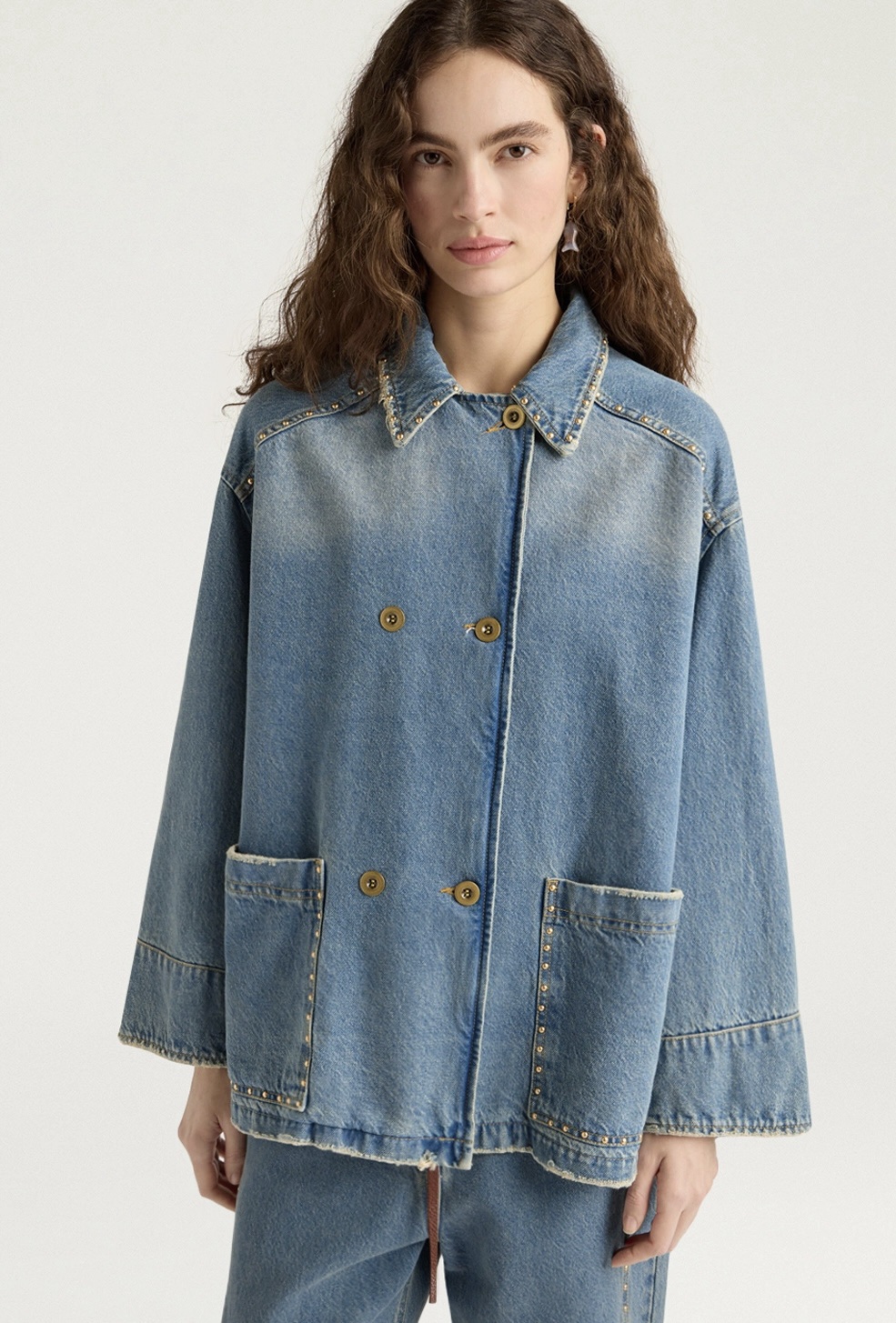 Oversized double-breasted denim pea coat with a stonewashed finish and distressed detailing for a worn look. Embellished with electroplated brass decorative rivets along the contours of the pockets, yoke, and stand-up collar. Flap pockets and tailcoat cuffs. Special four-hole metal buttons.