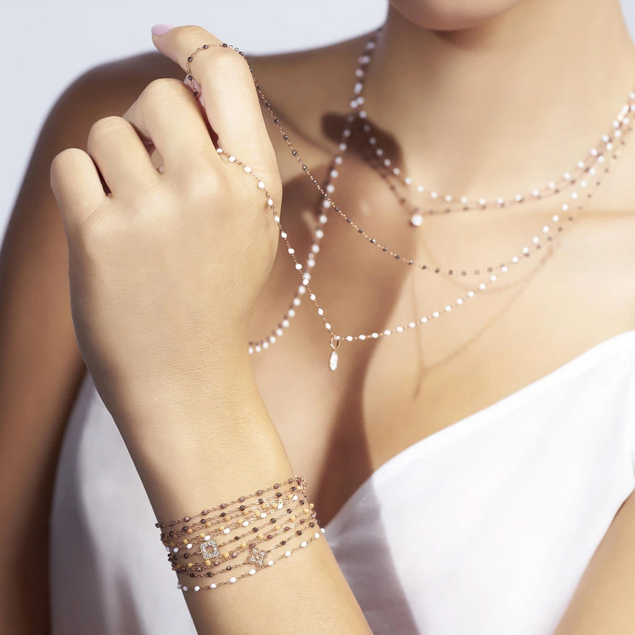 Gigi only uses the best materials, 18 carat gold, diamonds, and a lacquer chosen for its shine and quality. This high-end resin offers a rich variety of colors. The artisanal application of this wonderful material onto the yellow gold chain is a real art. It’s the result of an entire team and a technique developed by Alain Clozeau.