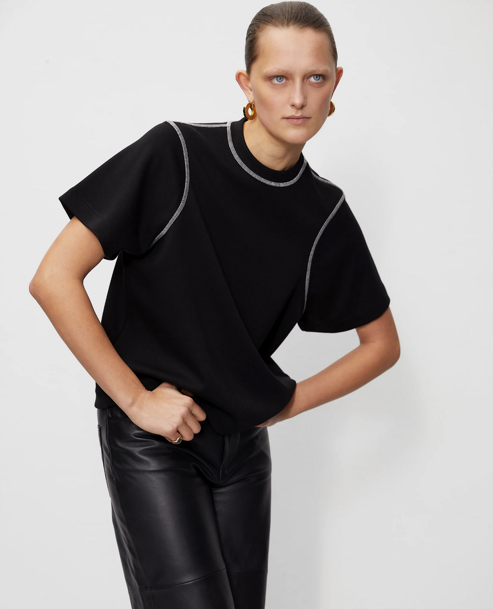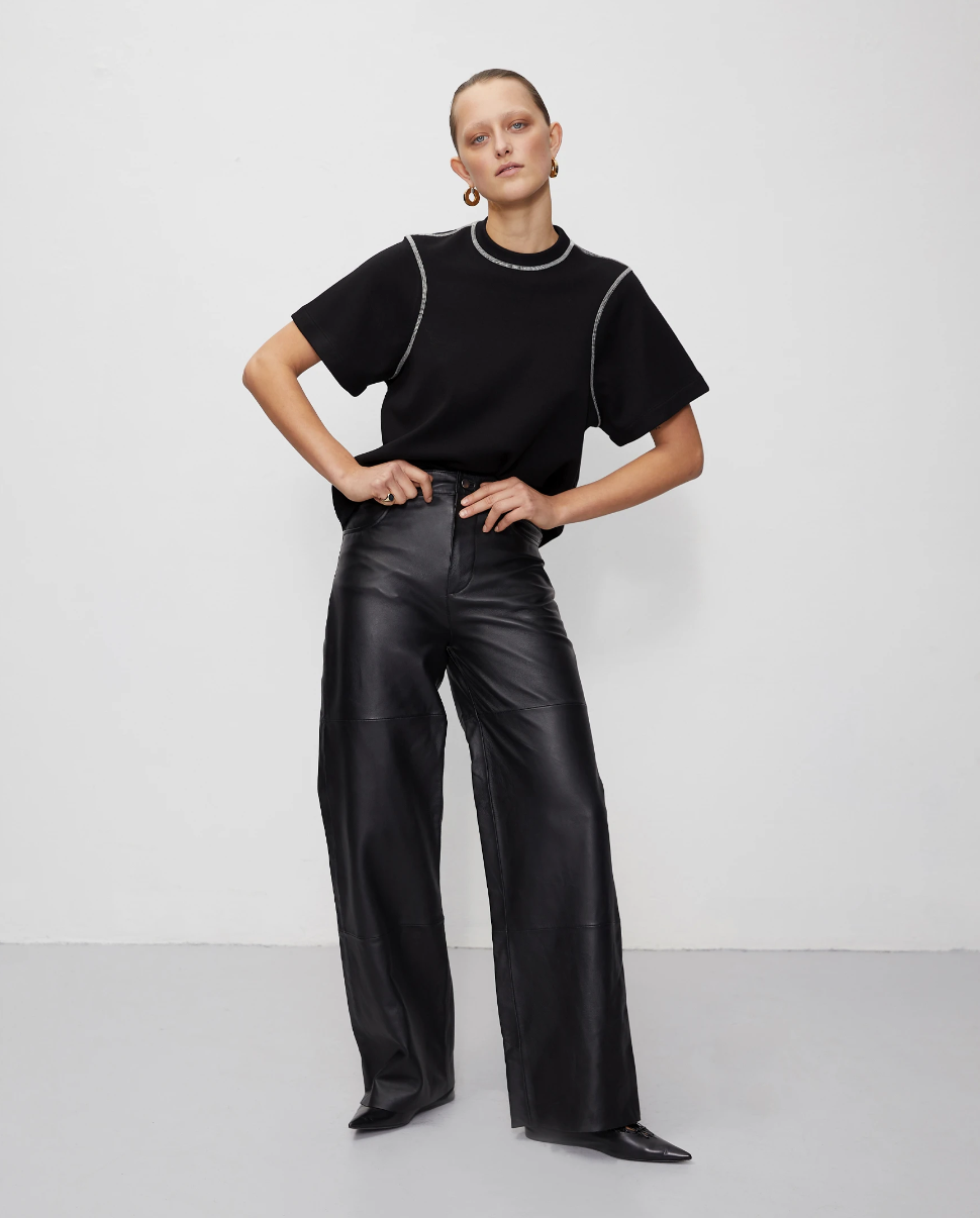Classic black wide-leg leather trousers.