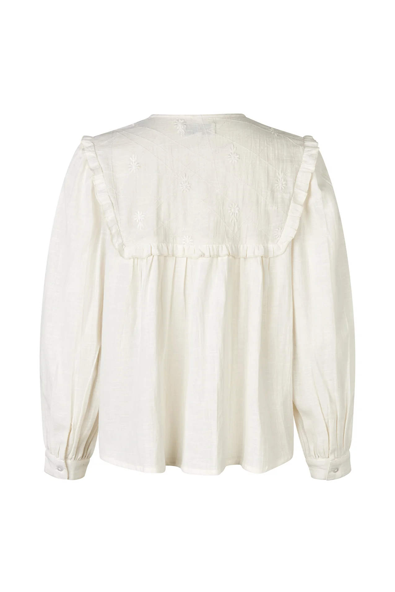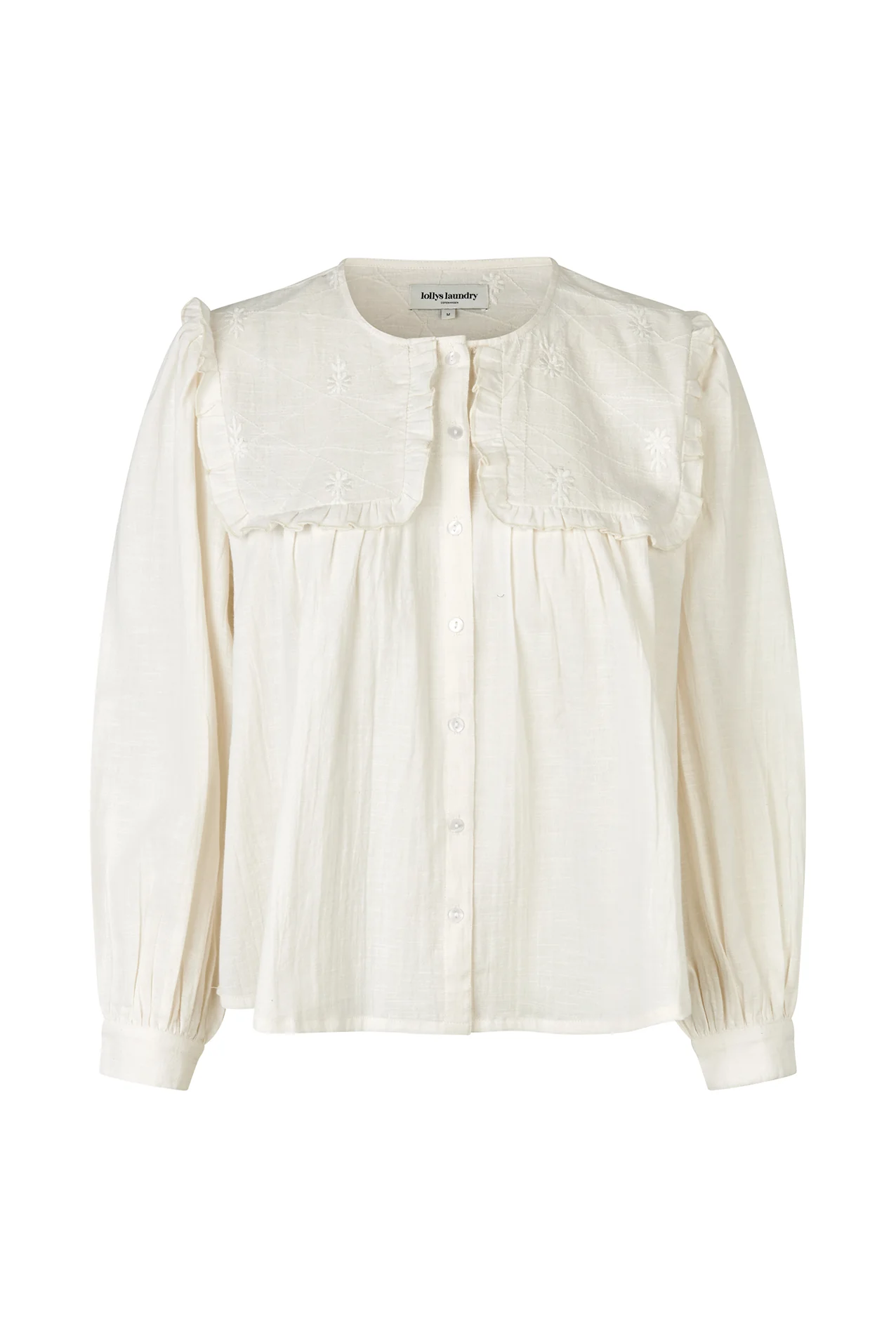 The Dooble shirt is a beautiful and feminine blouse in a classic off-white shade, perfect for both everyday wear and more formal occasions. It is made from a light and comfortable 100% cotton material with delicate embroidered details on the wide, decorative collar, adding a romantic and sophisticated touch to the design. The shirt features long sleeves with slight puffing at the shoulders and cuffs with button closures, giving it an elegant look. It has a full button-down front, and the loose fit ensures comfort throughout the day. The Dooble shirt can easily be paired with both jeans and skirts for a casual yet stylish look.