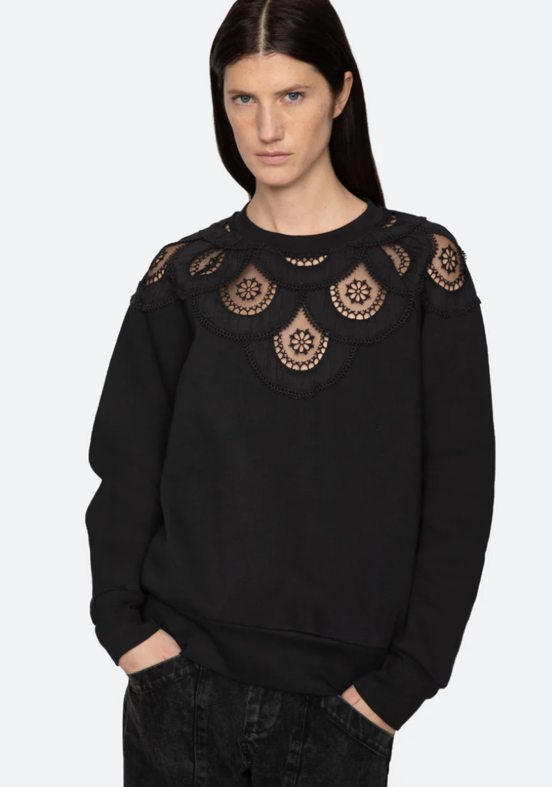 The Drea combo sweatshirt features intricate embroidered detailing throughout and sheer accents. Designed for an easy, relaxed fit.