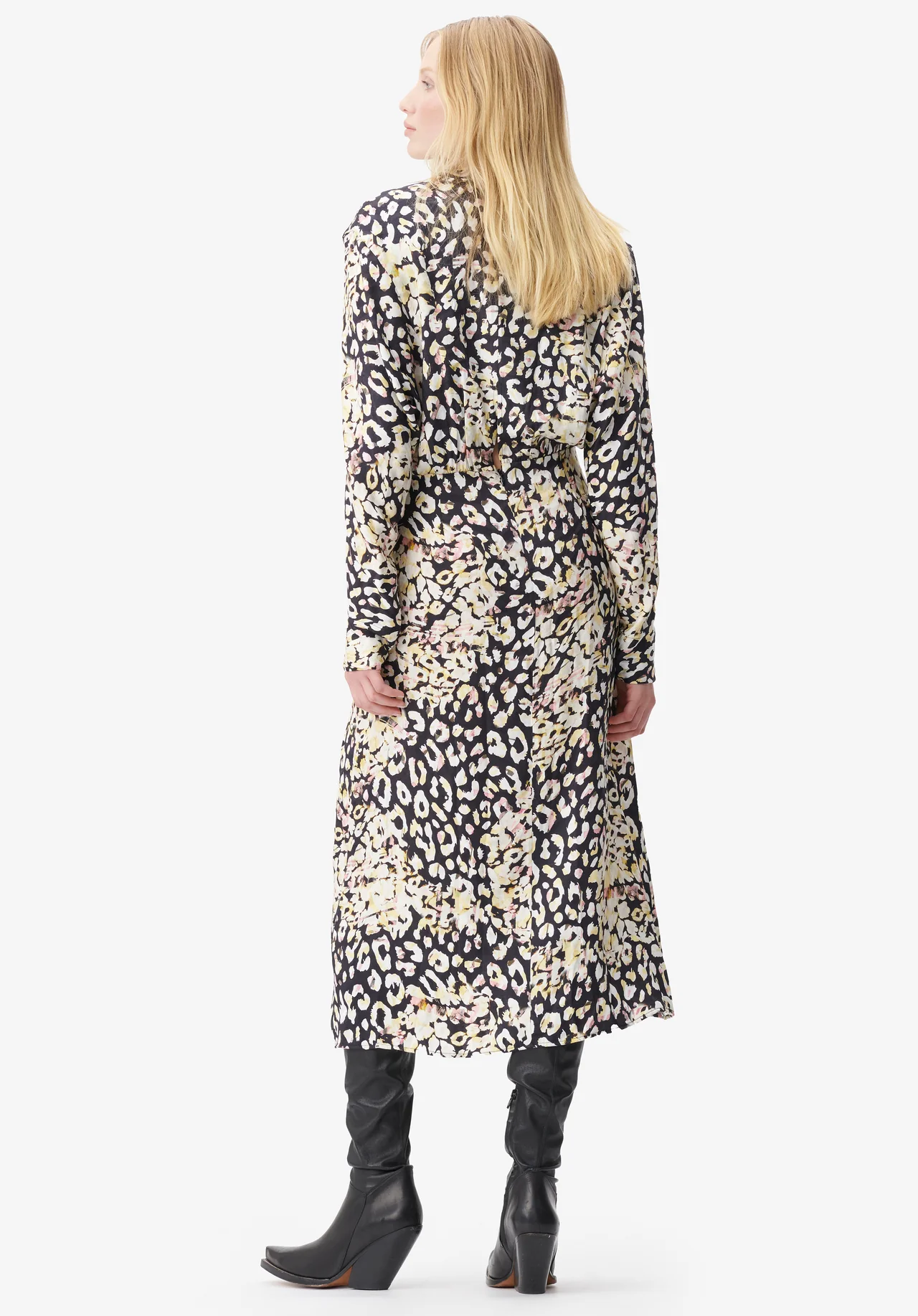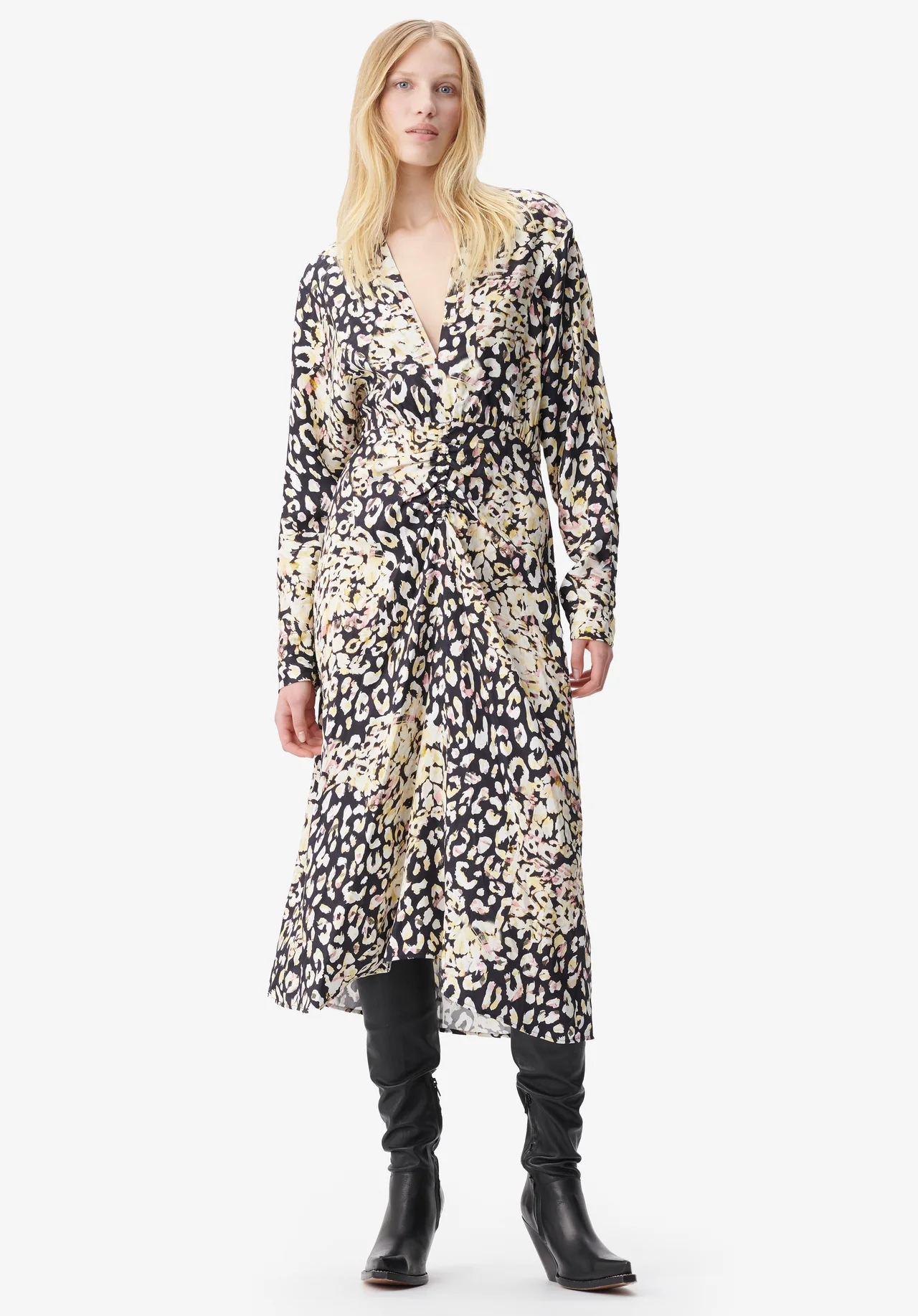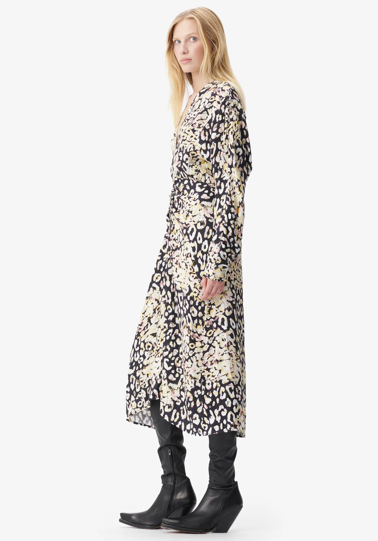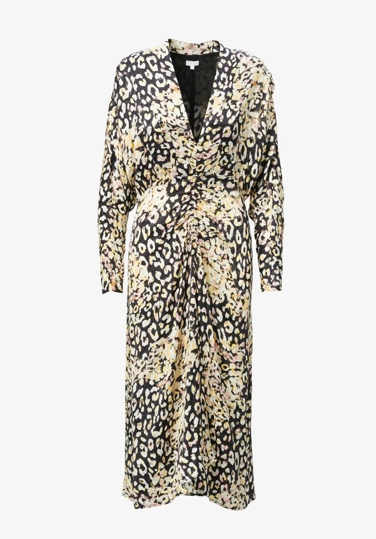 A flowing viscose jacquard design is complemented by a vibrant leo print and yellow and pink pops of color. Diala is characterized by a blouson-like upper part, feminine gatherings at the waist, and a sexy v-neckline. The wide batwing sleeves add drama to the flattering silhouette, and the back slit allows you to move freely.