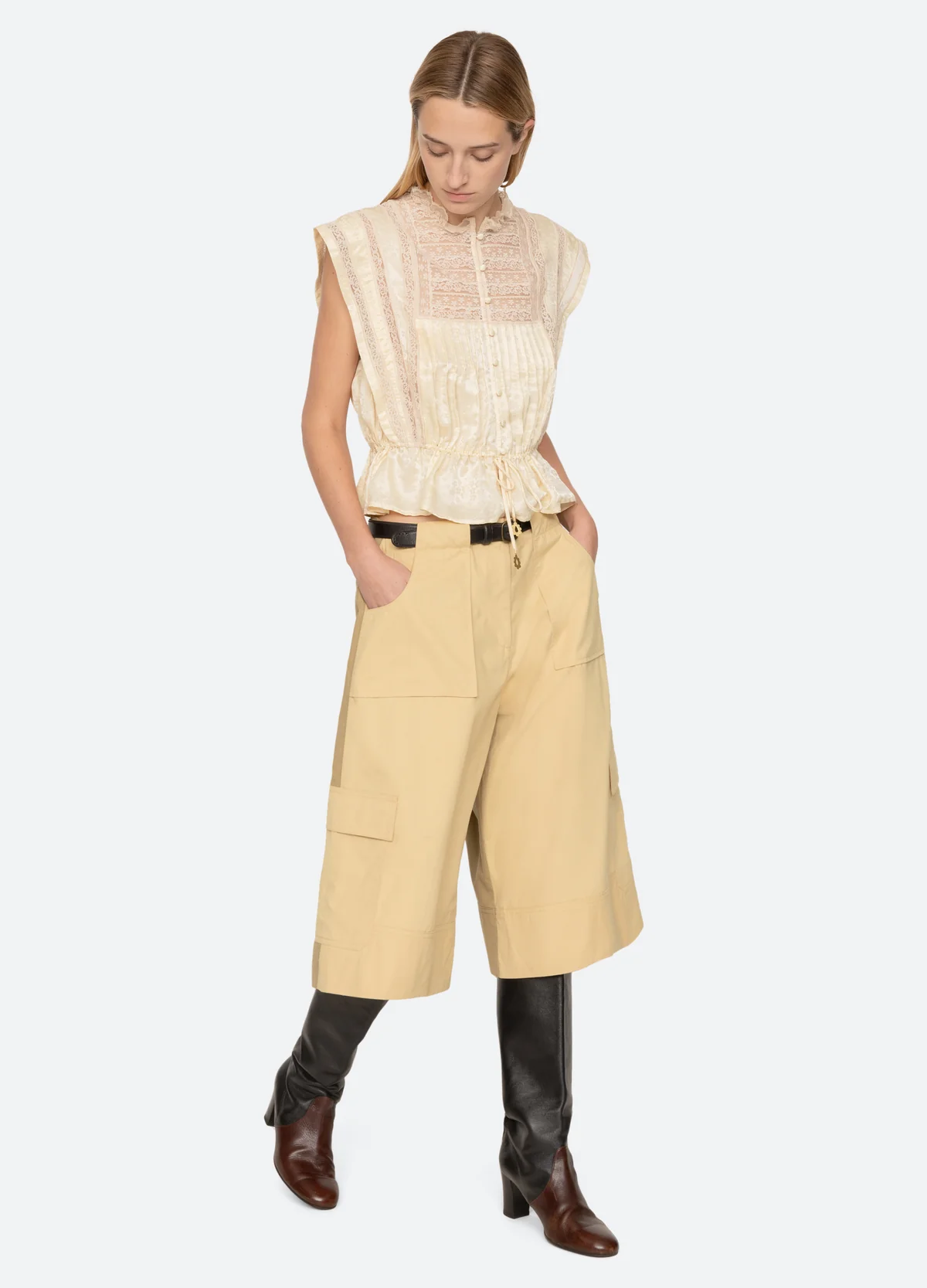 The Ethel top features a delicate floral motif with lace inserts throughout and adjustable drawstrings at the waist. A feminine silhouette that feels both romantic and timeless. Button front. Designed for a relaxed fit.
