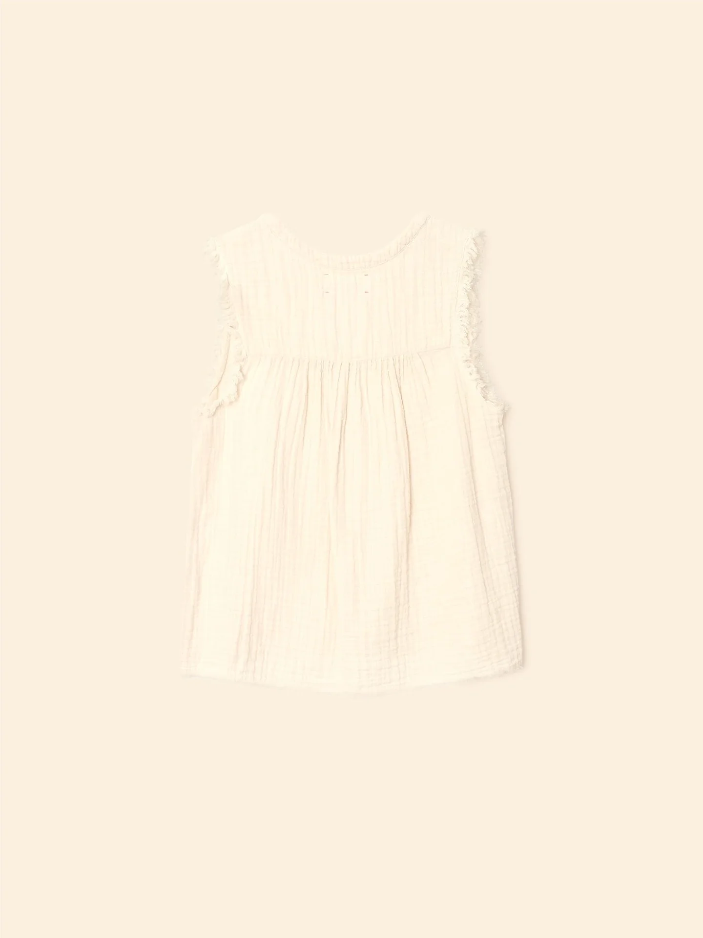 Easy Breezy. Evva is new this season in our washed double faced cotton gauze for a soft, gently crinkled feel. This sleeveless pullover top features a V-neck with bar tack details, raw edge sleeves and bottom hem, and shirred front and back yokes.