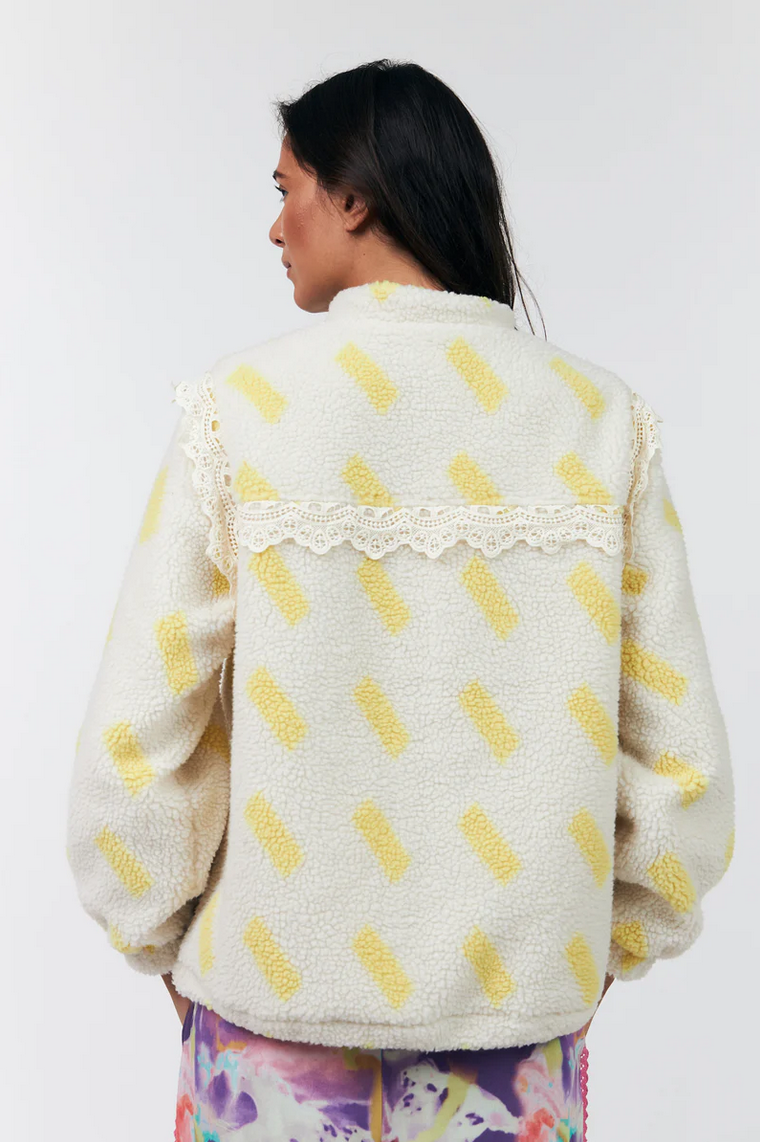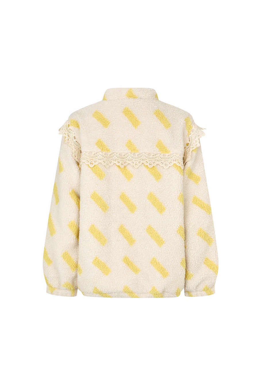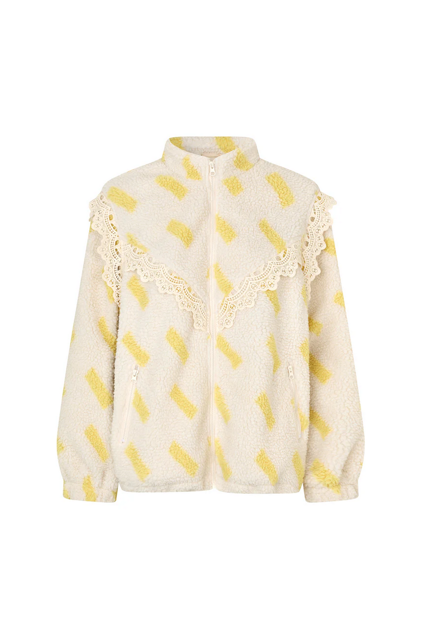 The FallLL jacket combines soft comfort with a feminine touch. It is made from teddy fabric with yellow details and is embellished with delicate lace. A jacket that feels cozy and looks stylish at the same time—perfect for everyday wear and the transition between seasons.