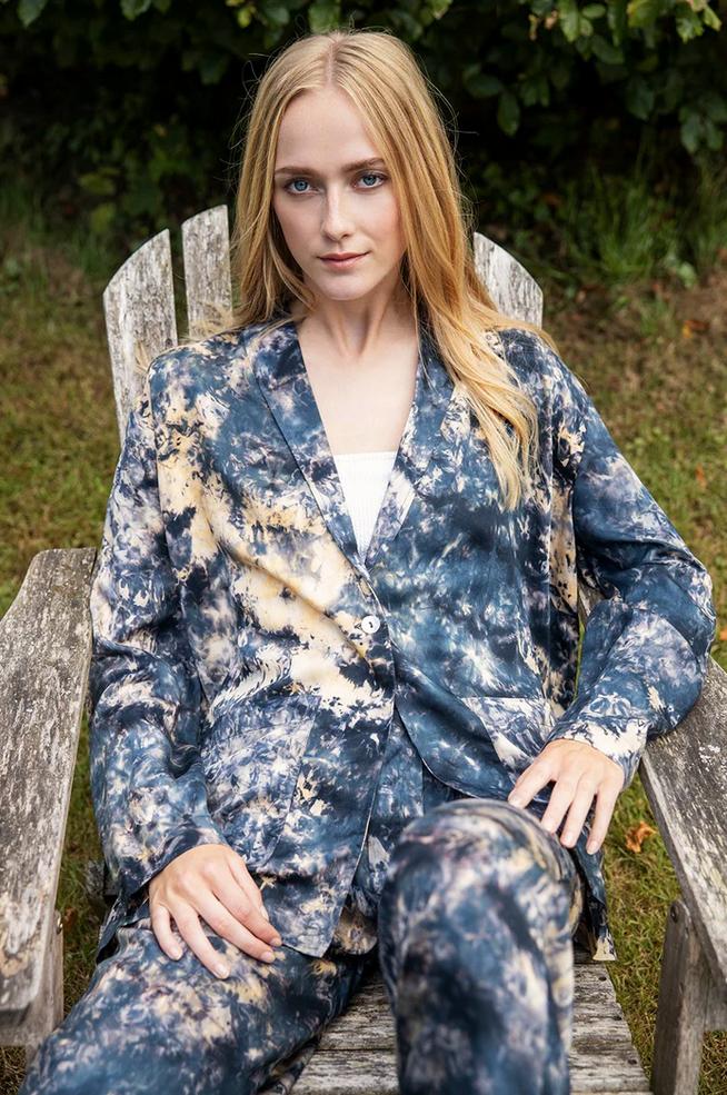 The tie dye is made by hand on a soft heavy modal sateen. The blazer is extra soft since the micro modal is created by using the finest cellulose fibres to create the unique hand feel.