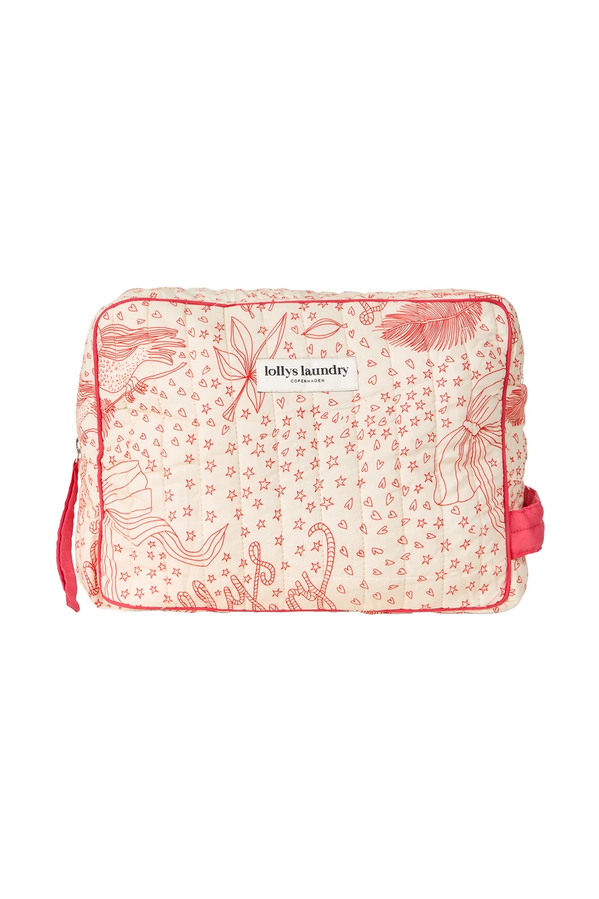 The toiletries bag is a soft and spacious toiletries bag in a quilted design with delicate, hand-drawn illustrations in a beautiful shade of red. Its size makes it ideal for toiletries, make-up and travel essentials.