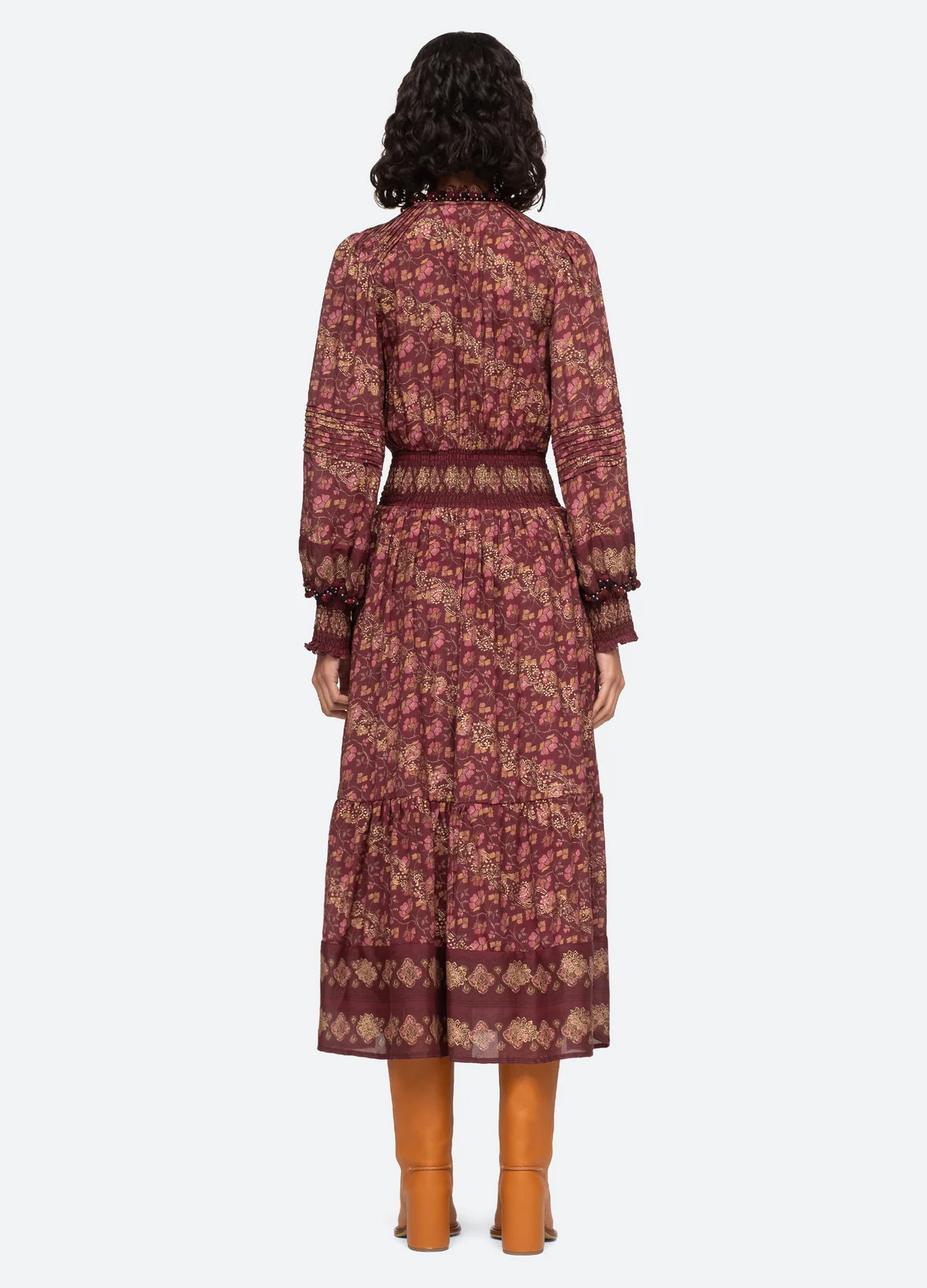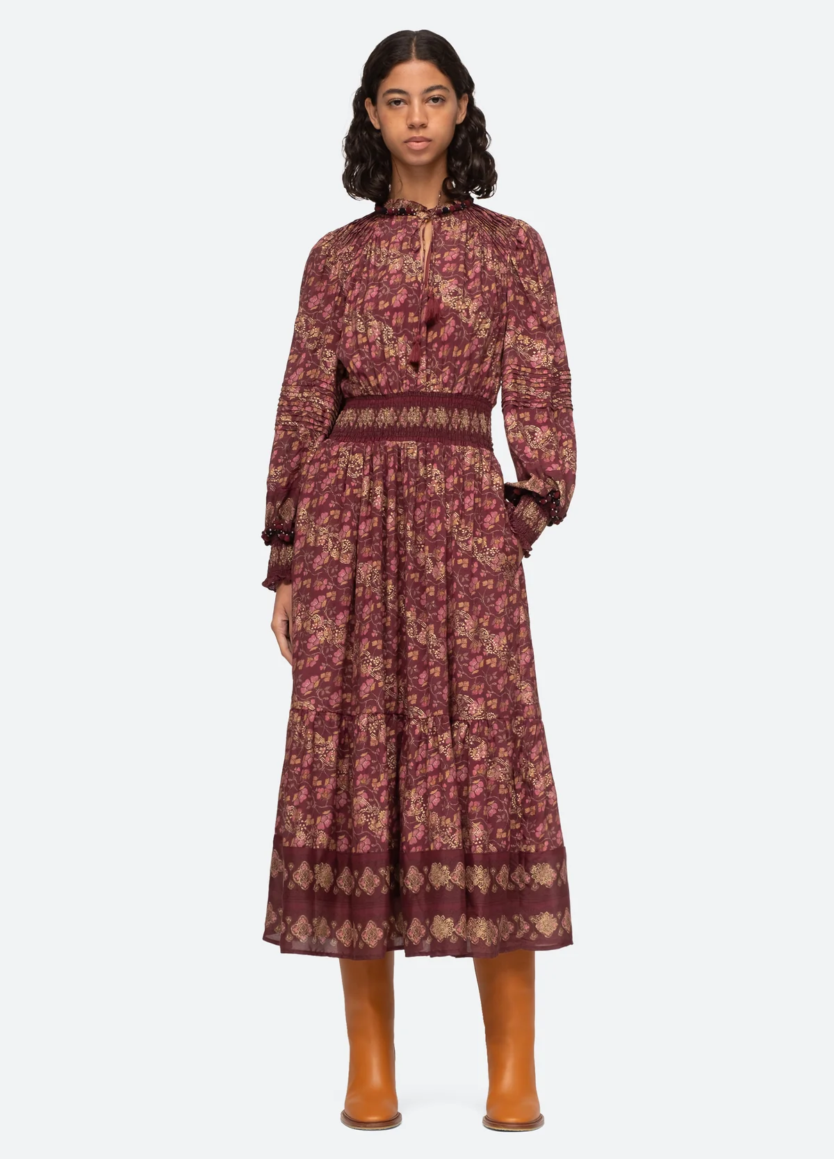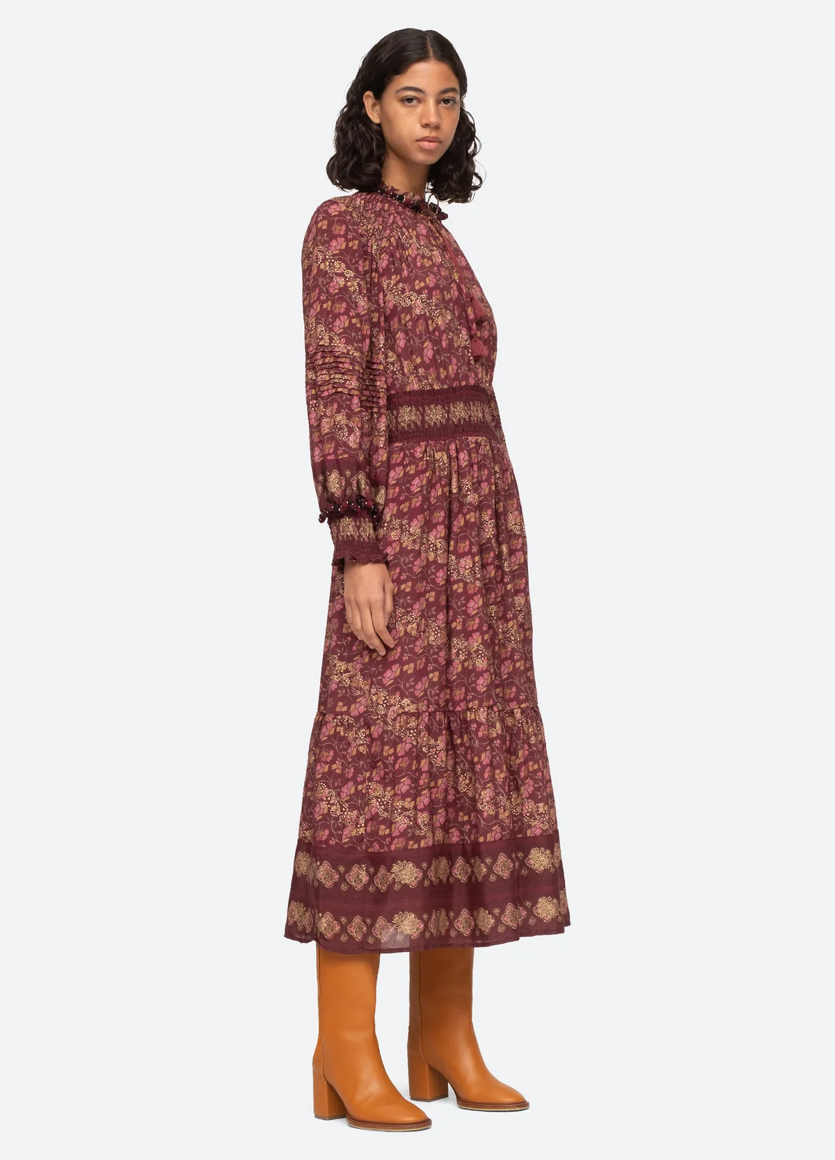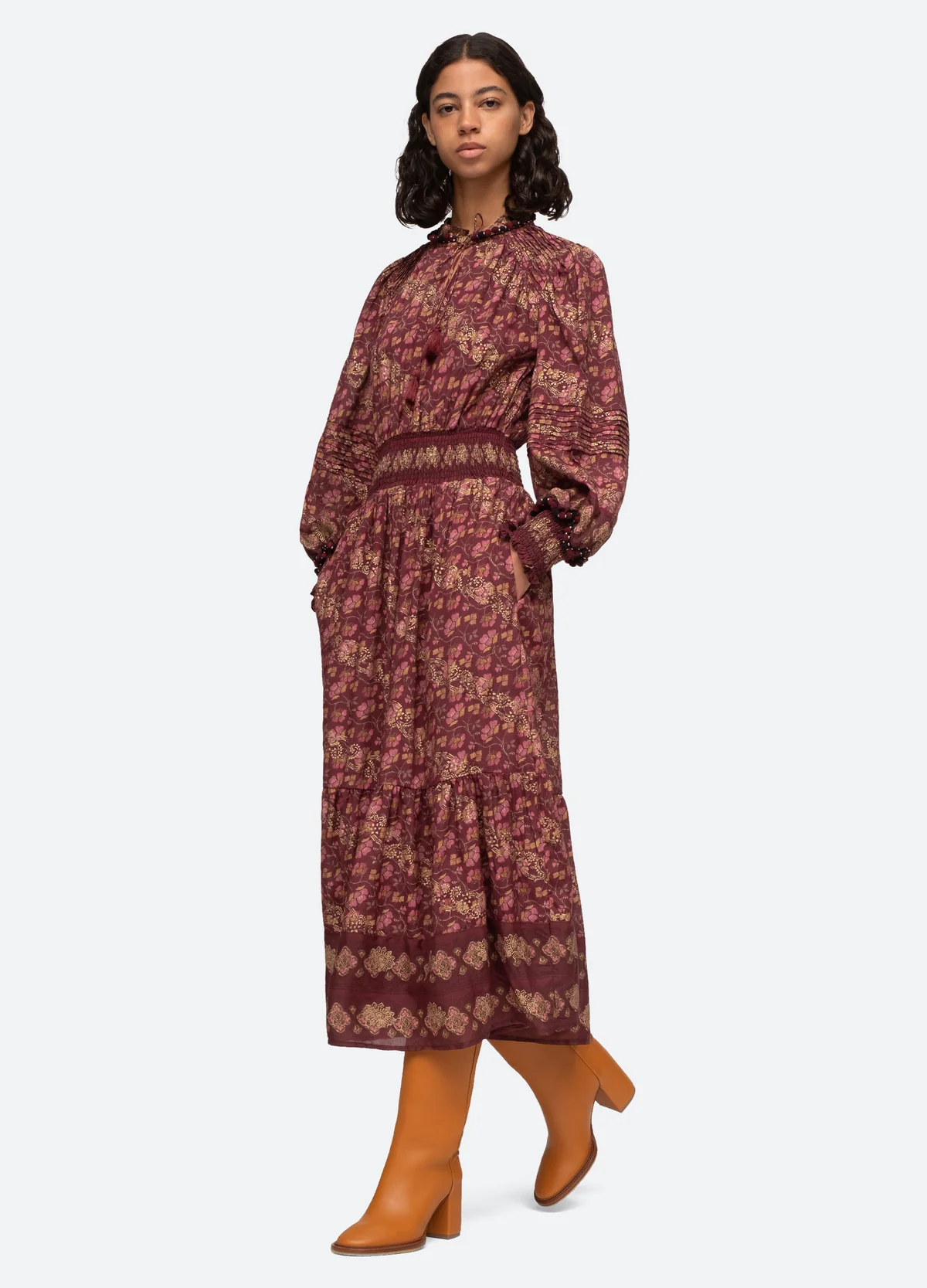 The Giulia dress is a long sleeved dress and has a midi length silhouette and a very soft pattern with a print.