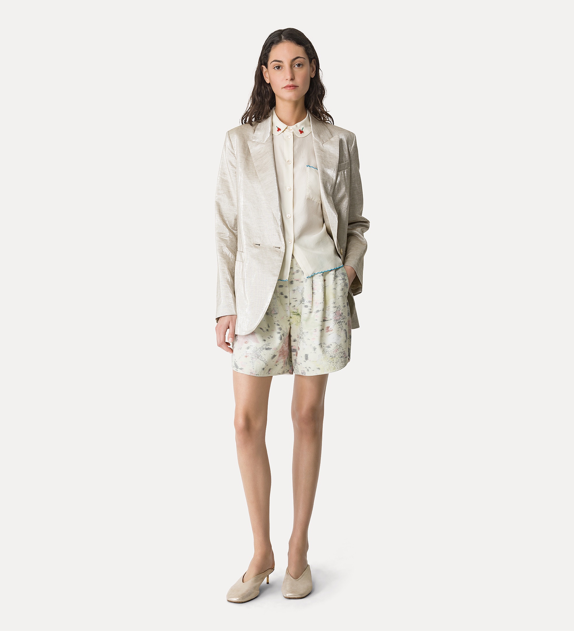 The iconic lines of the habotai silk half–sleeve shirt reflect the spirit of the new collection thanks to the scalloped edges, finished with shiny thread, and the small floral embroidery in colourful beads. this precious silk blouse with embroidery and inserts is set apart by its artisanal details, perfect for wearing around the city or for versatile layering with summer tops.