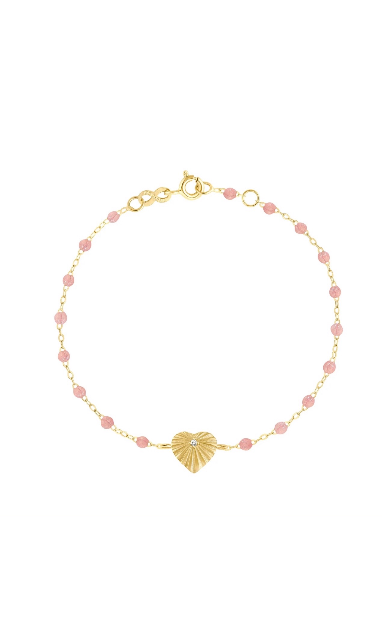“Heart Lumière”, a most precious declaration of love, an ode to passionate love and infinte sweetness.18 carat gold Heart Lumière bracelet with resin pearls. 18 carat yellow gold pendant set with a diamond.