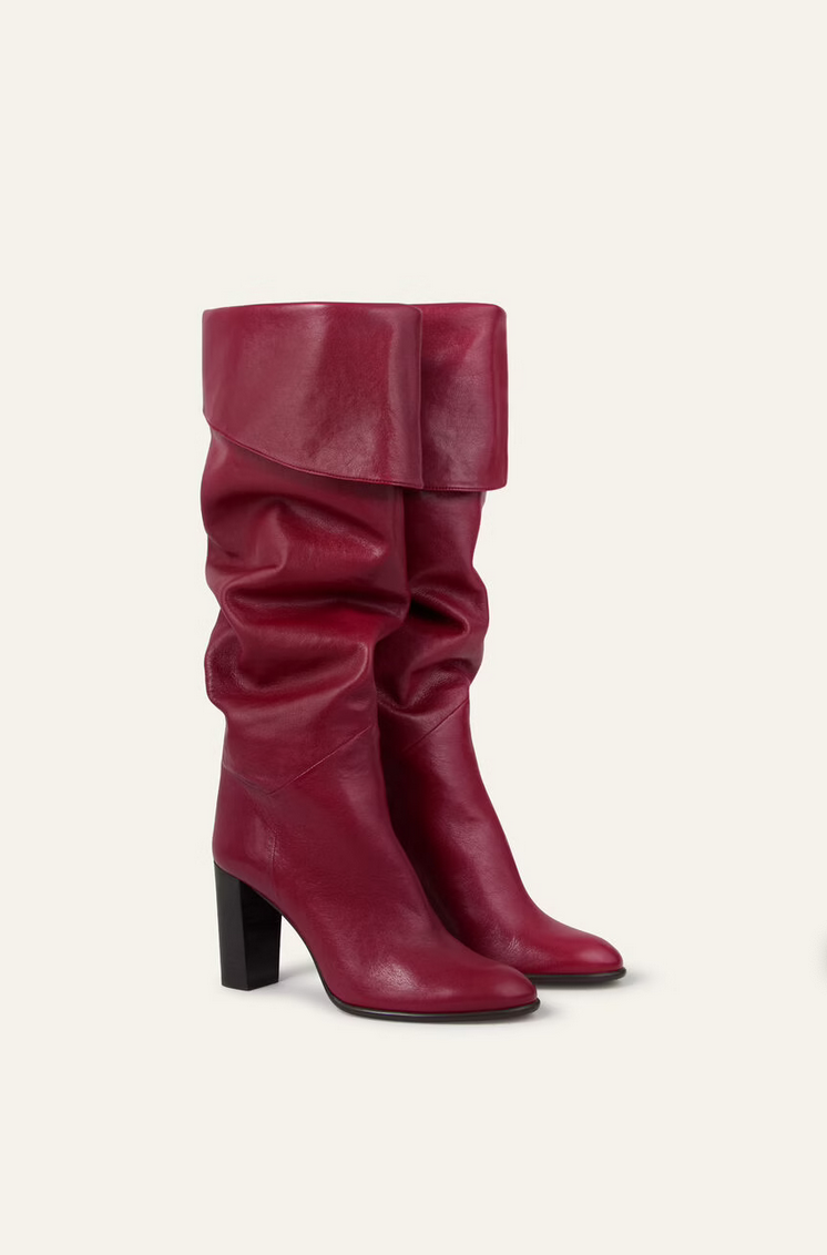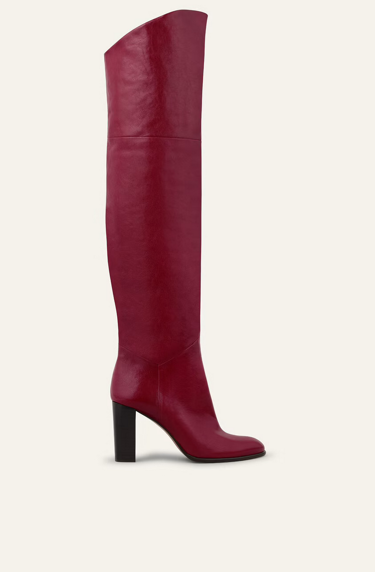 Bold, supple red full-grain leather, perfectly fitted to the leg