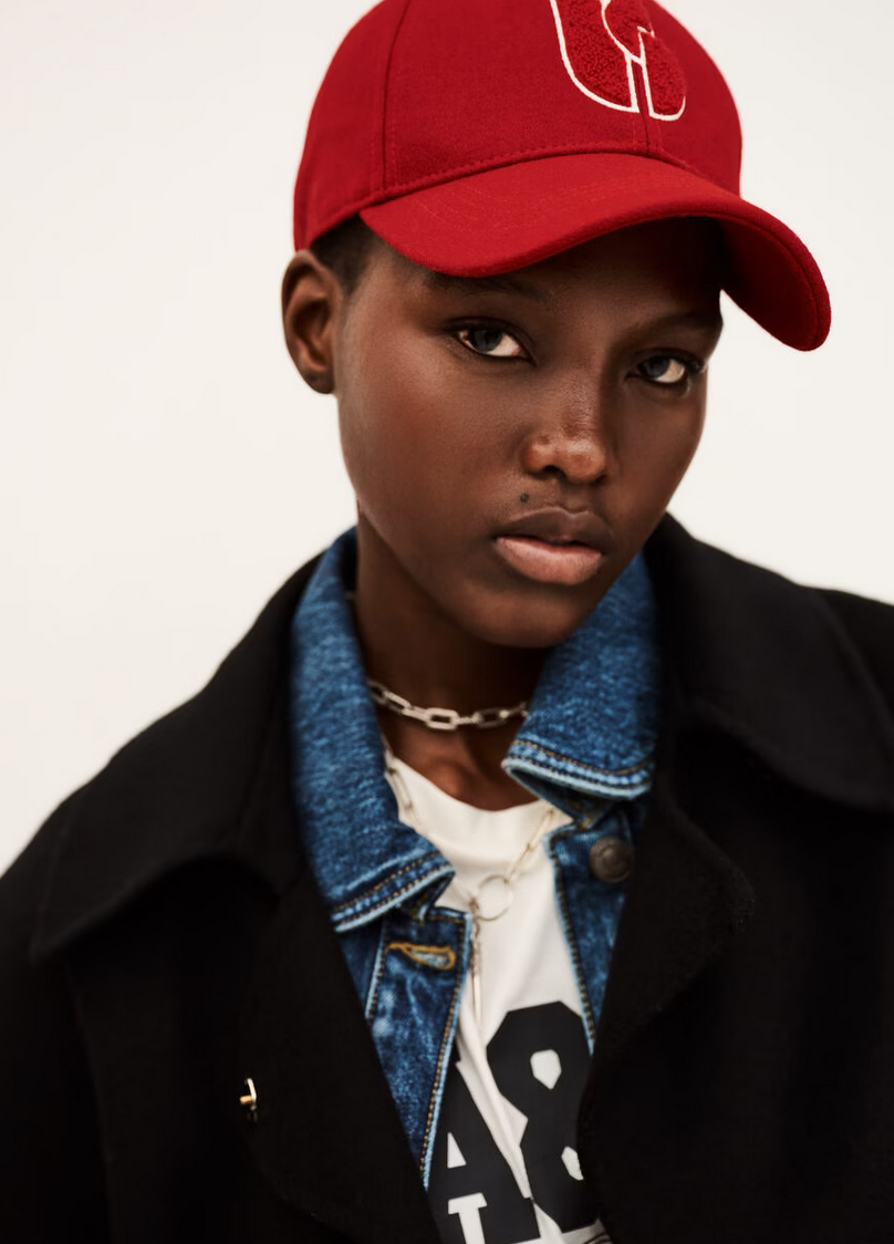 Red cap with a curved brim. Thick wool fabric and the signature logo on the front