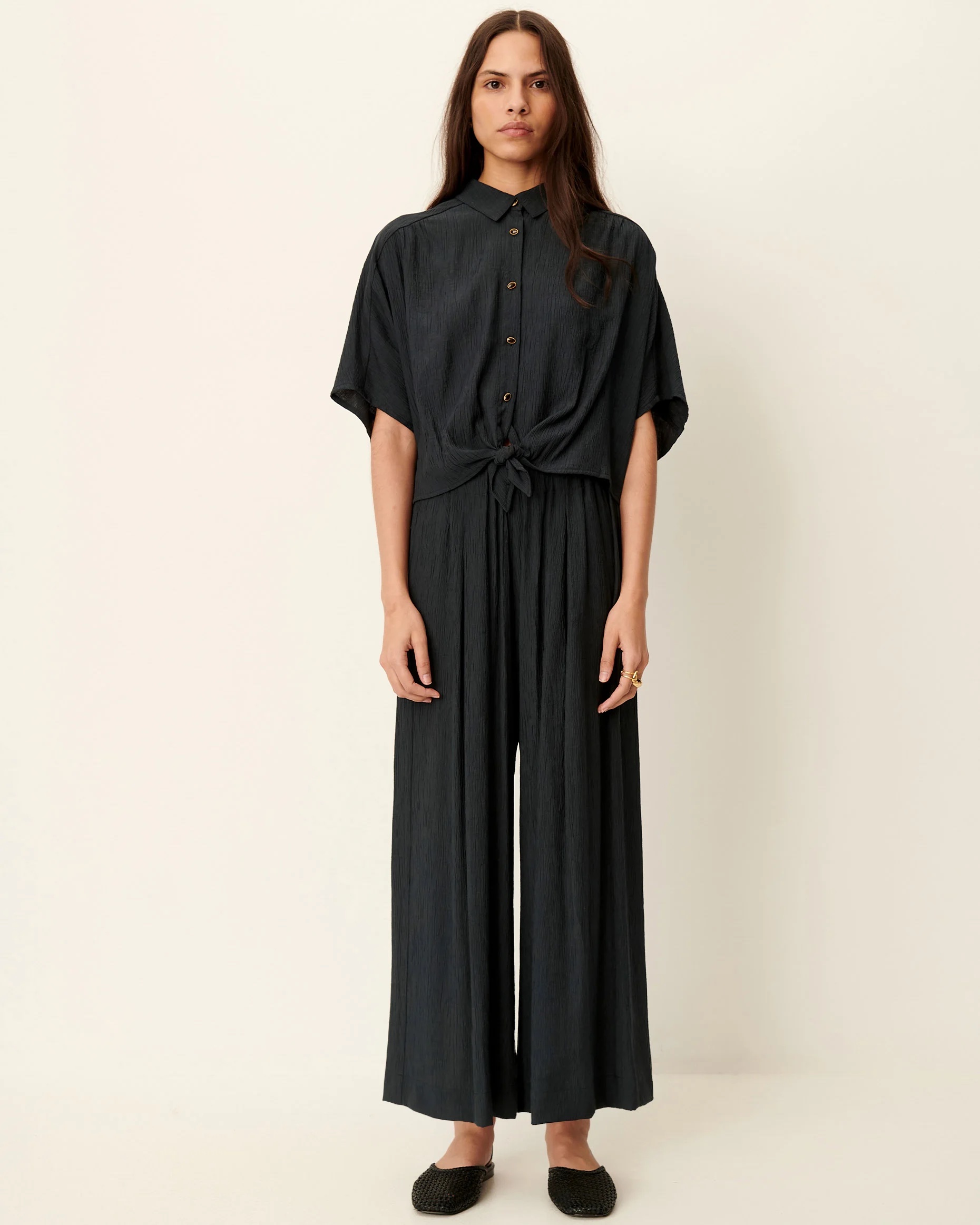 Loose-fitting 7/8-length trousers with elasticated waistband in soft viscose seersucker crepe.