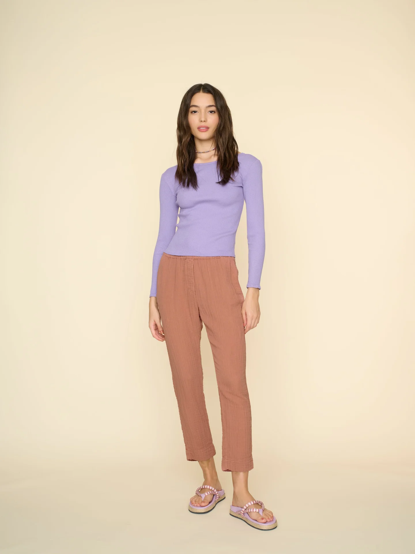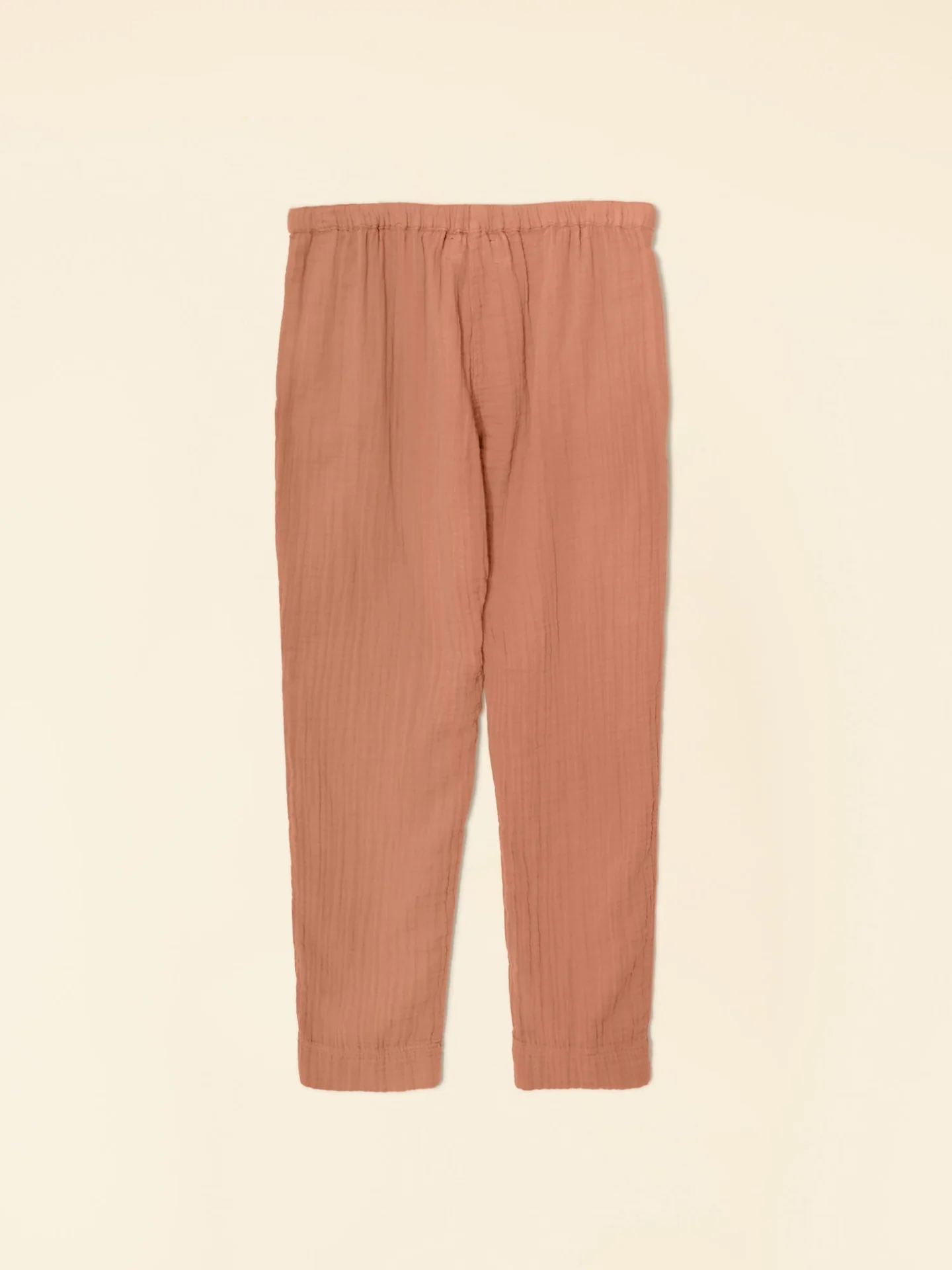 Good Gauze. Jordyn is made in washed double faced cotton gauze for a soft, gently crinkled feel. This easy pull-on pant has a drawstring waist and side seam pockets.