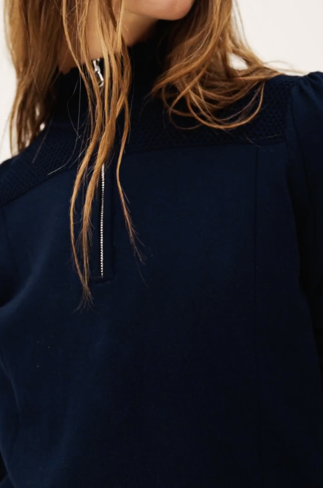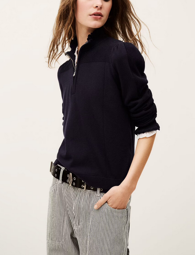 Simple and elegant this jumper is the perfect transeasonal knit for the Spring. – Zip fastening. Embroidery details on collar and cuffs with a straight fit .