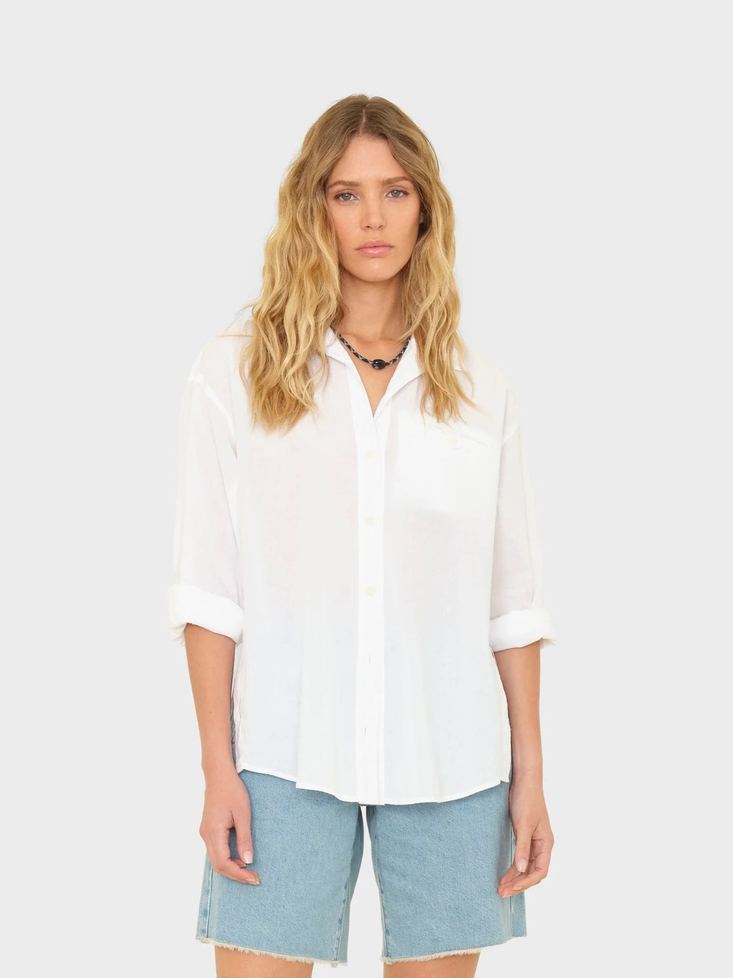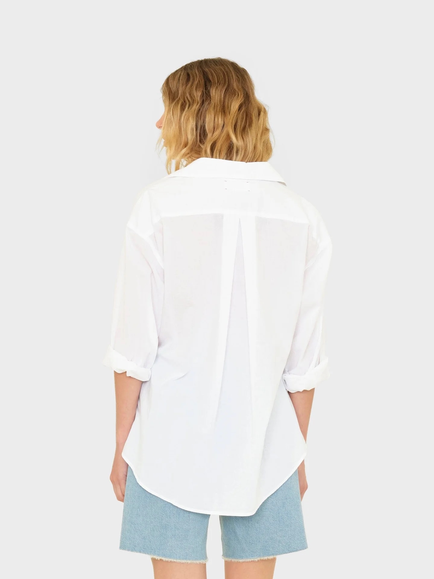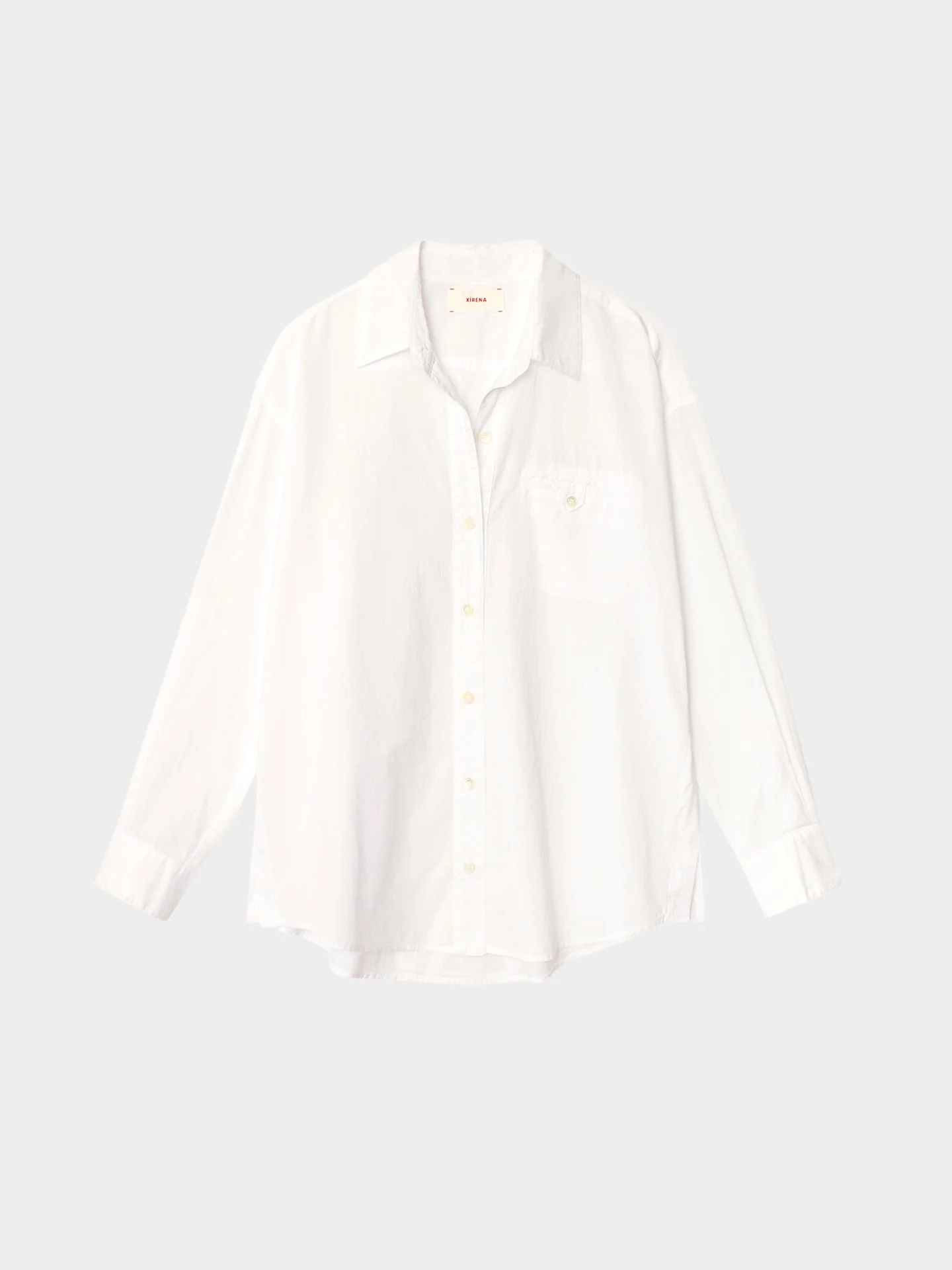 Easy does it. Kamden is new this season in our classic lightweight woven cotton poplin for a lived-in look and feel. This oversized button-front shirt features a left chest pocket with button-tab detail and hidden side buttons at the hem.