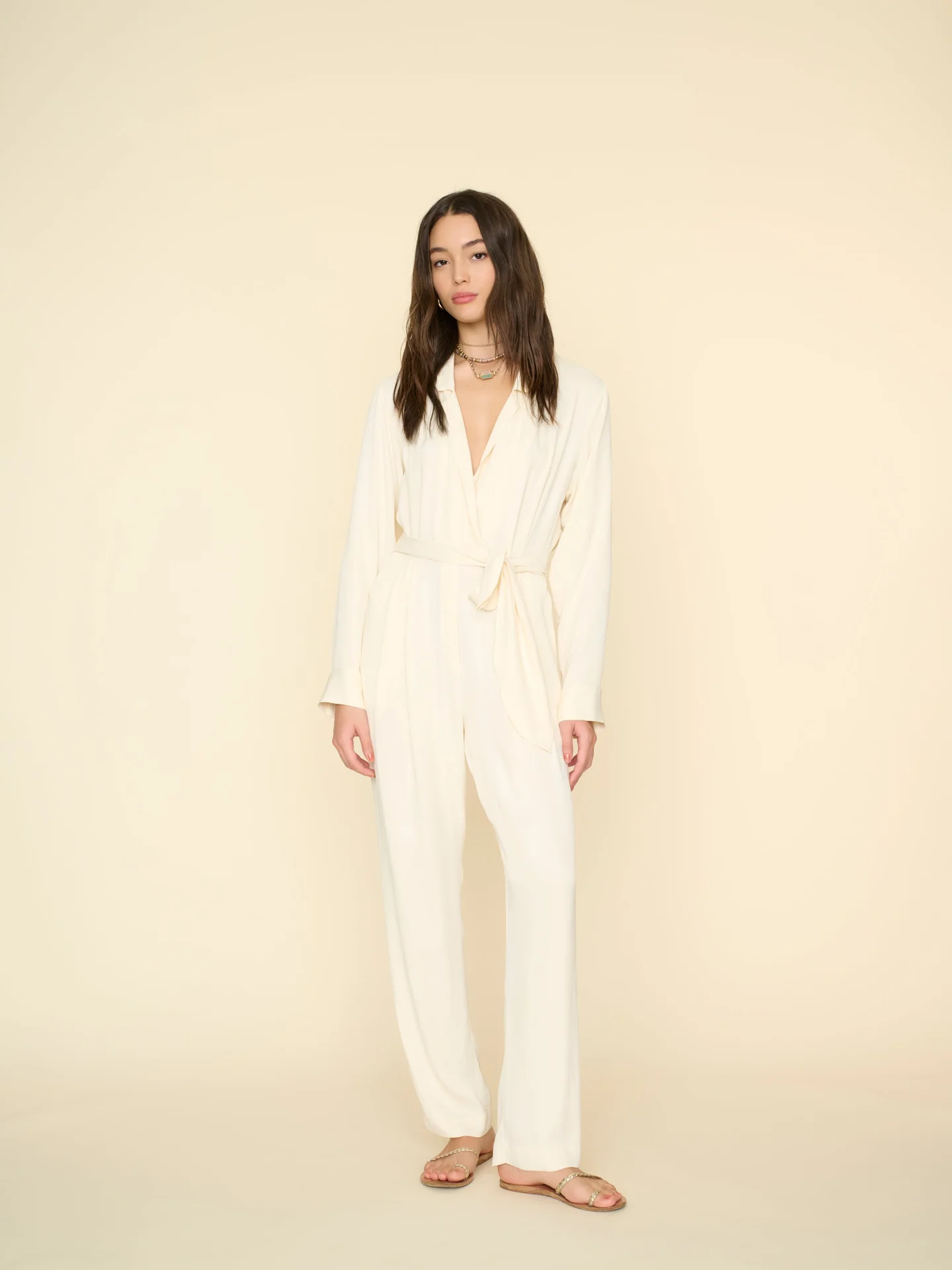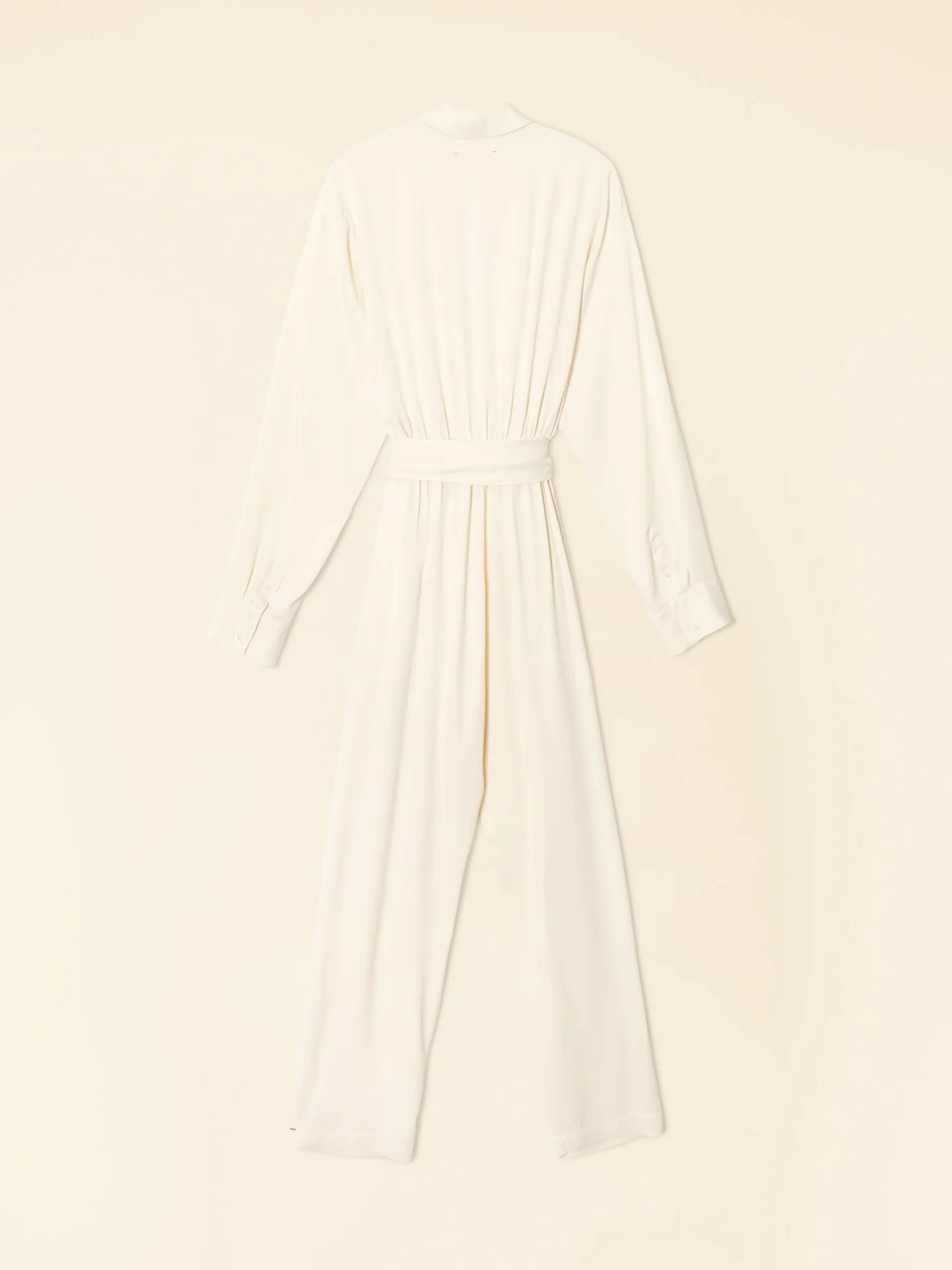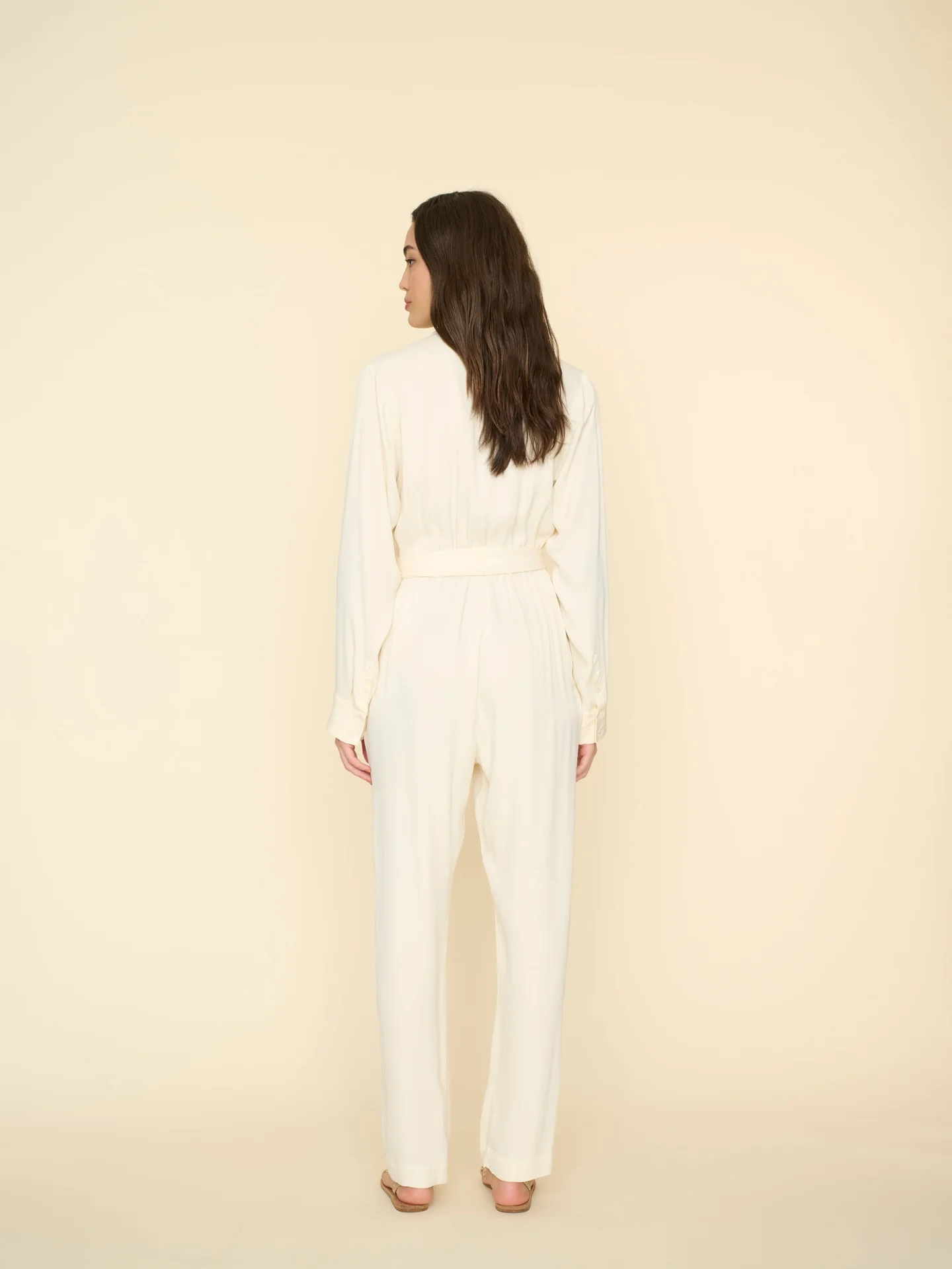 Hidden Gems. Killian is new this season in our rayon viscose with a matte satin finish. This elevated straight-leg jumpsuit features a notched collar, hidden button-front, shirred front, faux fly, self-belt with thread belt loops, side seam pockets, and a hidden elastic back waist.