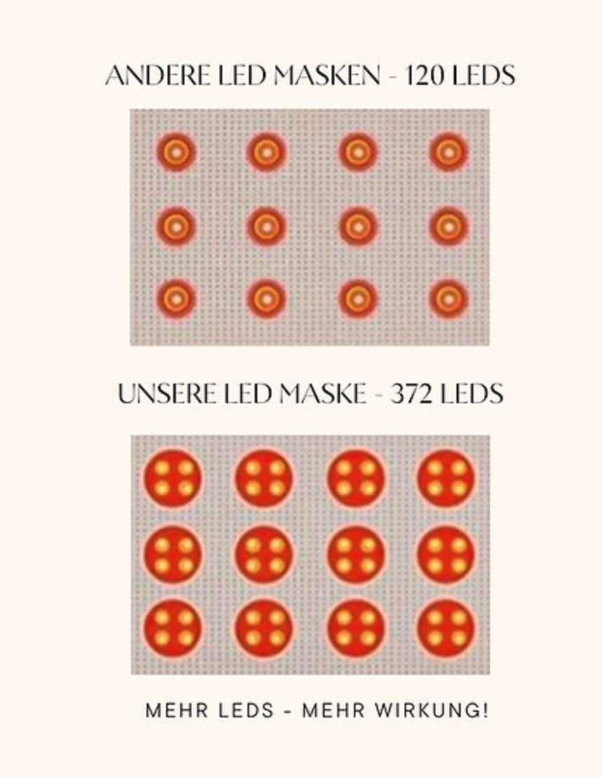 Our silicone LED light therapy mask sets new standards in skincare. With 372 high-precision LED lamps, it specifically stimulates collagen and elastin production – for visibly firmer, smoother skin and a youthful glow. Fine lines and wrinkles are gently plumped up and the formation of new wrinkles is effectively slowed down.