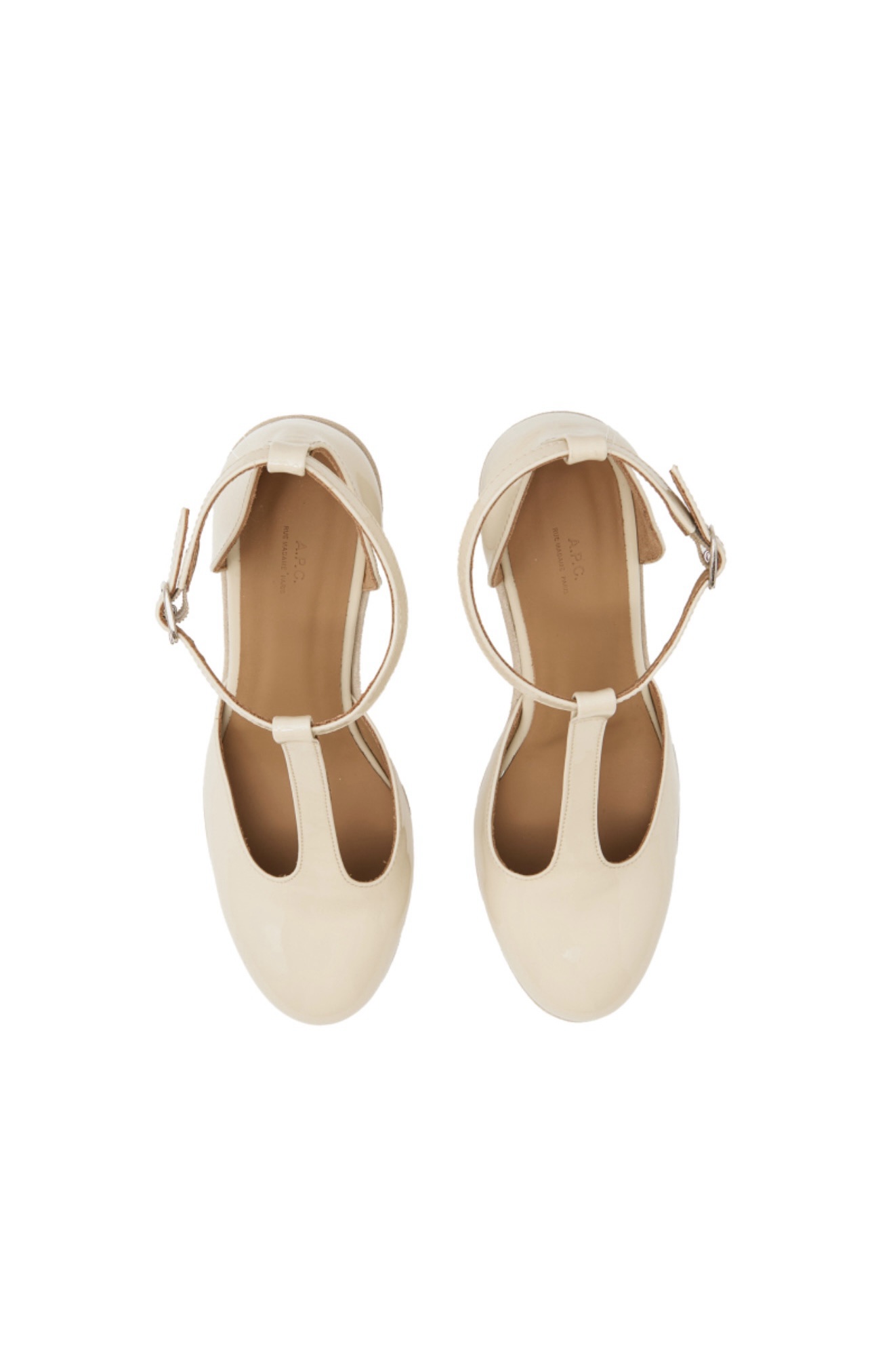 T-strap on the instep connected to an ankle strap with an adjustable metal buckle.