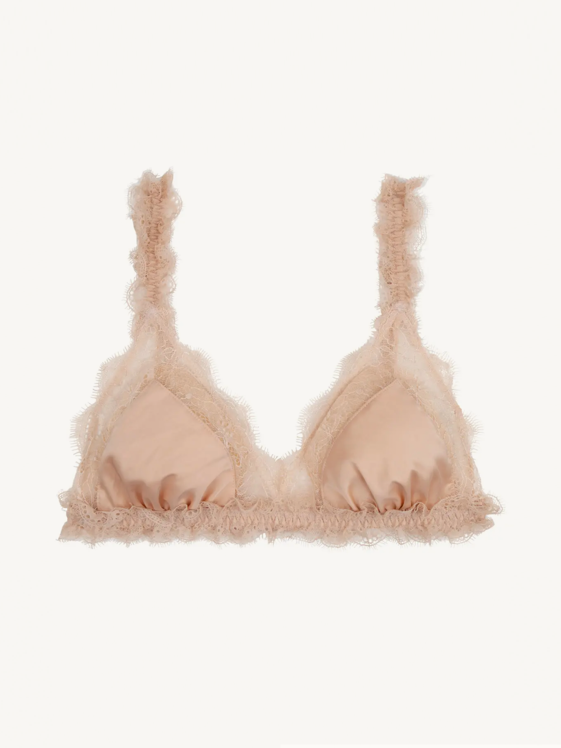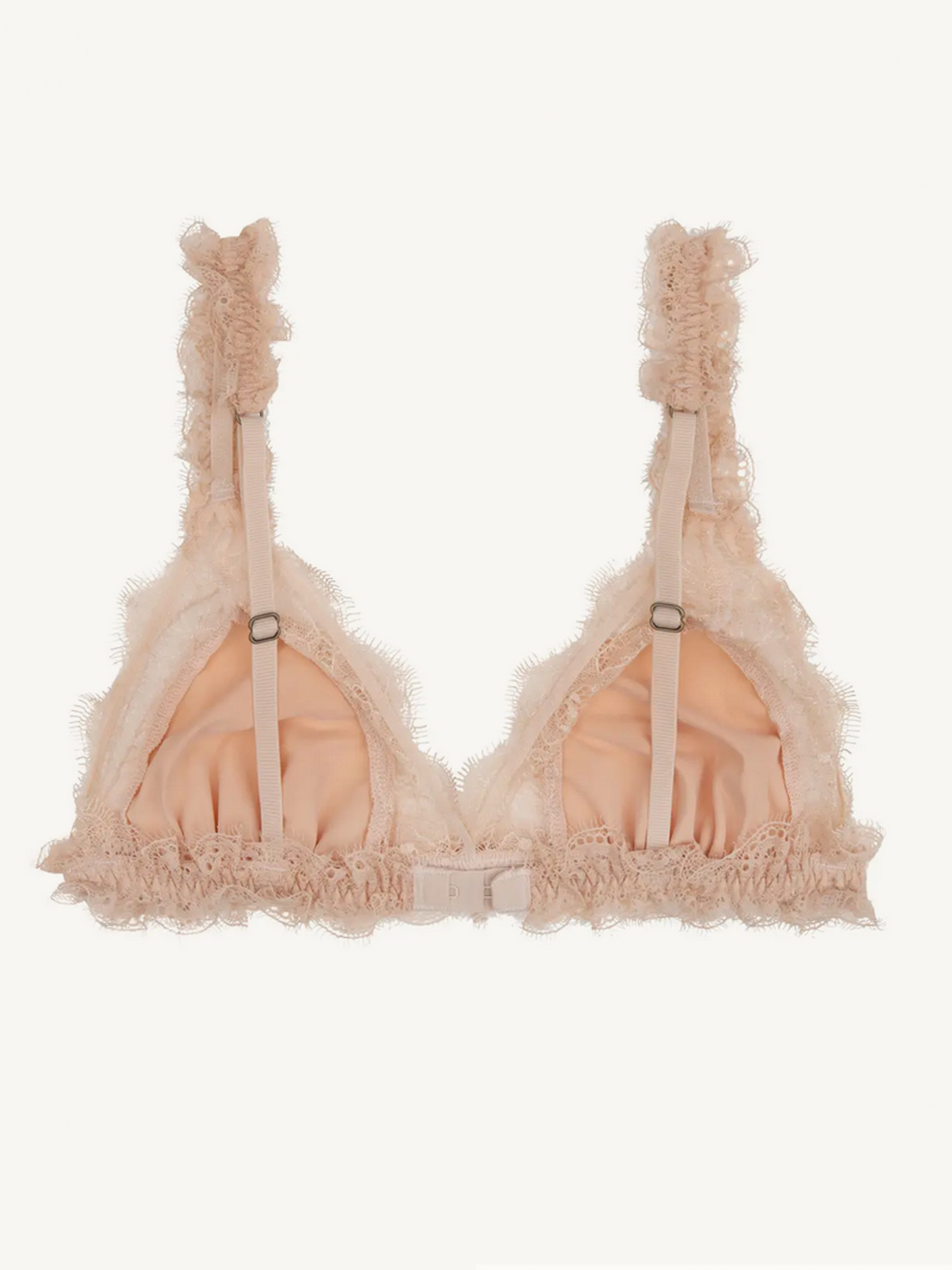 Delicate triangle bralette in sand. Cut from soft lace with a satin finish. The small triangles have gathered detailing at the underband.