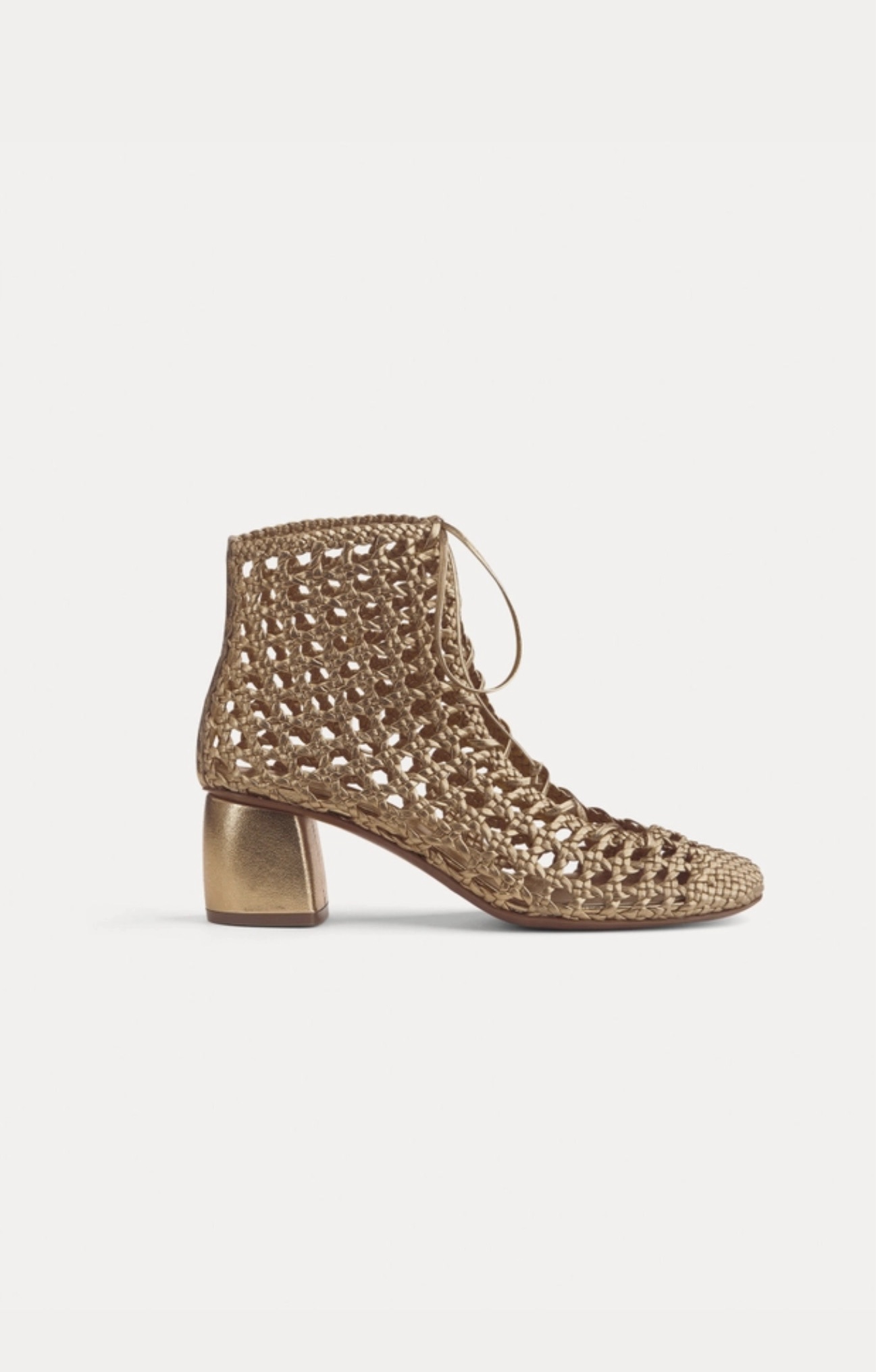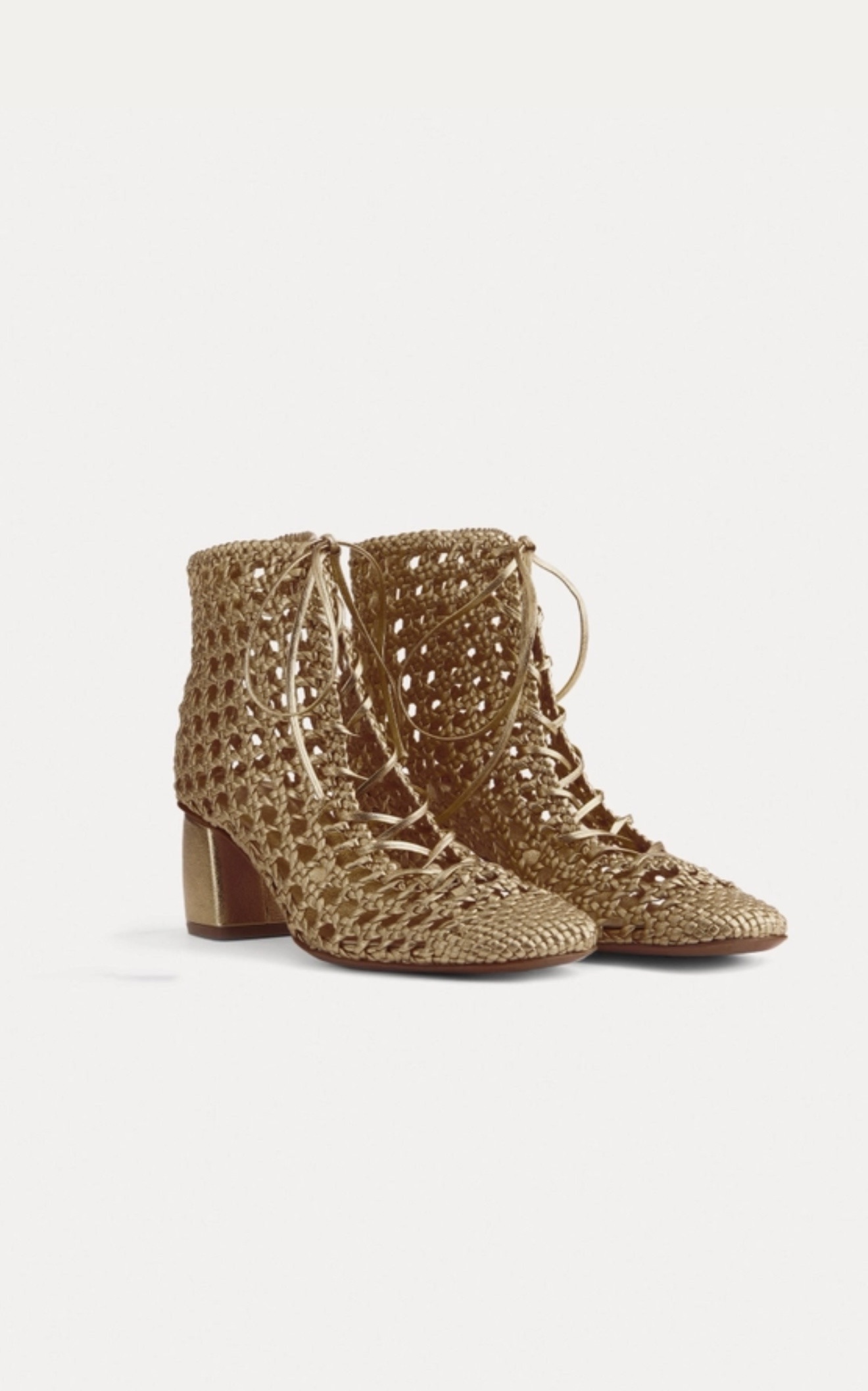 Hand–woven ankle boots made of strips of nappa and ties that rise up the foot arch in a crescendo of sensuality while the perforated pattern creates a classy see–through effect. these woven ankle boots also feature a contoured heel with tonal covering and are extremely figure–flattering.