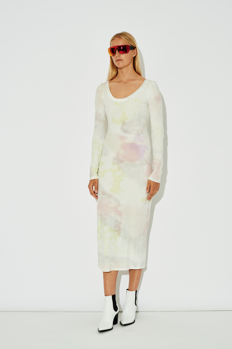 An unfussy form-fitting, long-sleeve dress in our signature, comfortable jersey makes a statement in uplifting multicolor bright tie dye with a striped effect. Layer with seasonal sweaters for a touch of warmth.