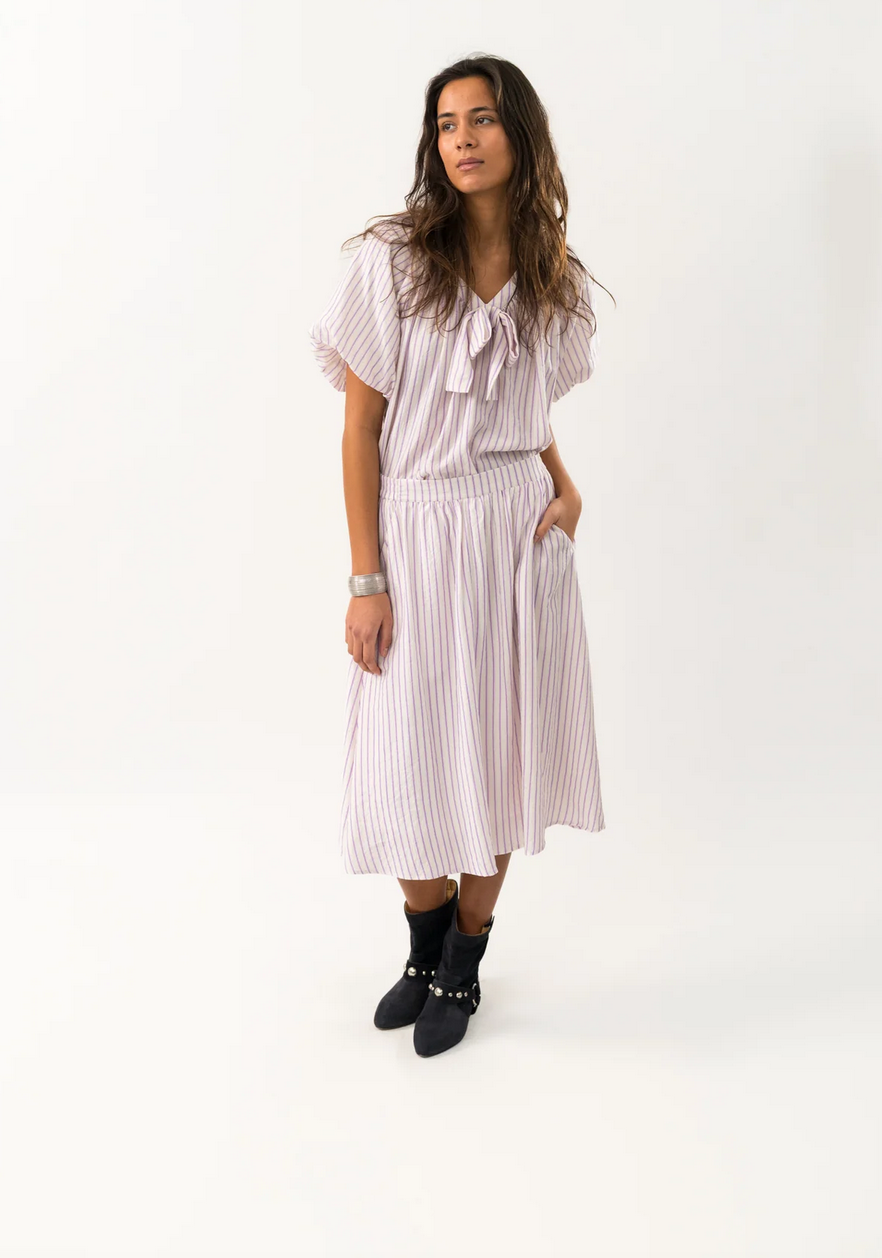 The Pine shirt is designed with a light and feminine expression, where the fabric drapes beautifully and feels wonderful against the skin. The soft lavender color and delicate stripes add a fresh and stylish touch to the wardrobe.