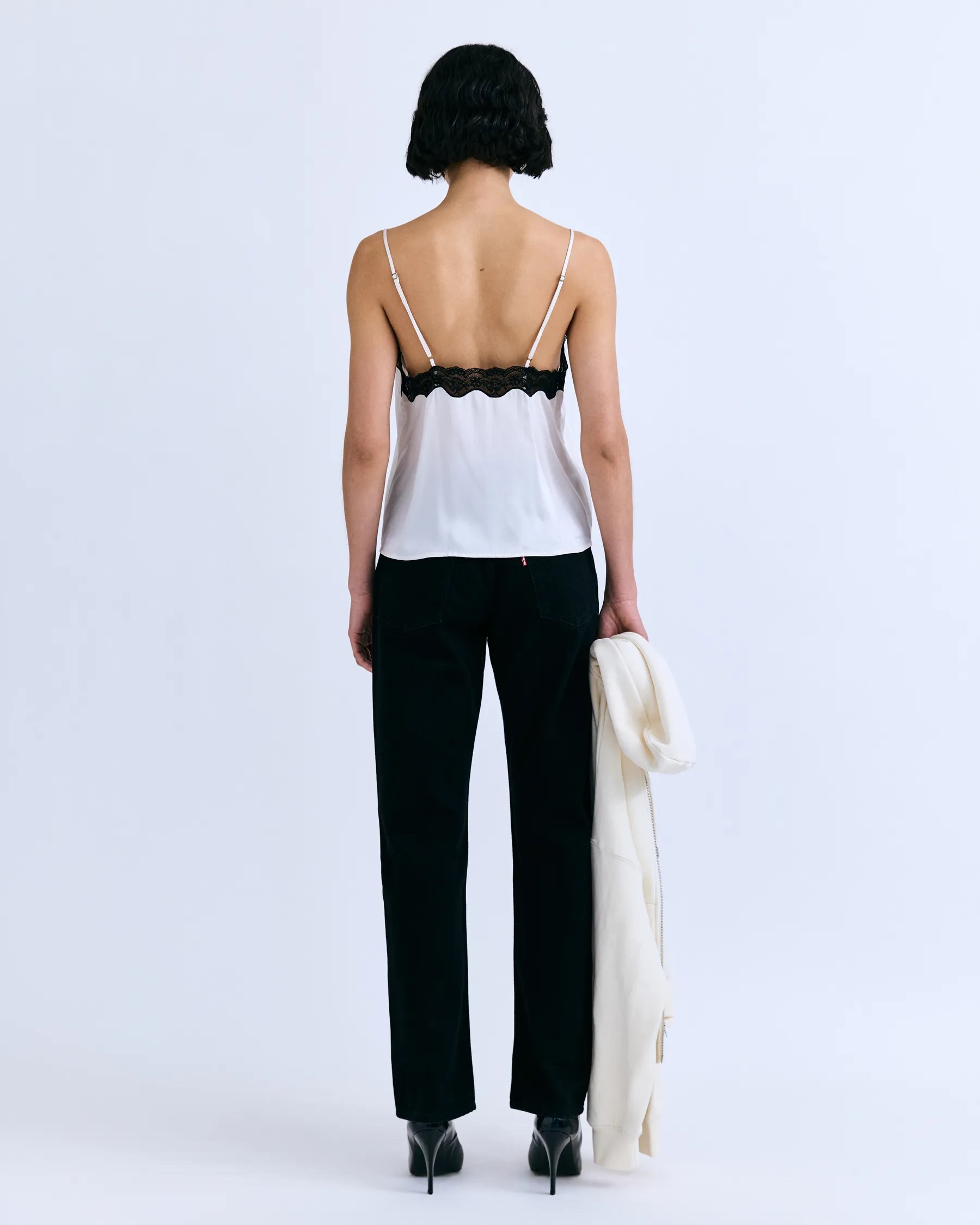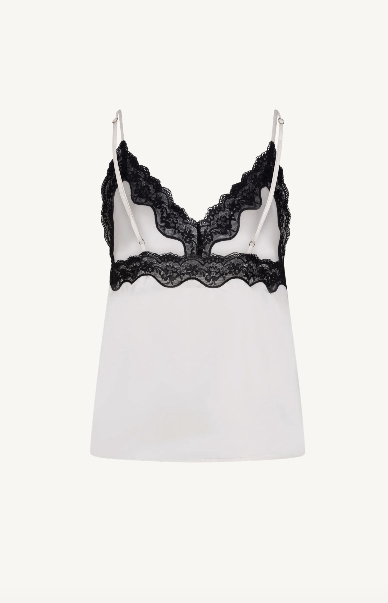 Luxurious camisole top in dark green. Cut from 100% silk. It has a gentle v-neckline. The triangles are framed with a wide lace.The hem is finished with a tiny, mouse teeth trim. Adjustable shoulder straps at the back. Â Relaxed, loose fitting style with a beautiful drape. Delicate hand wash only
