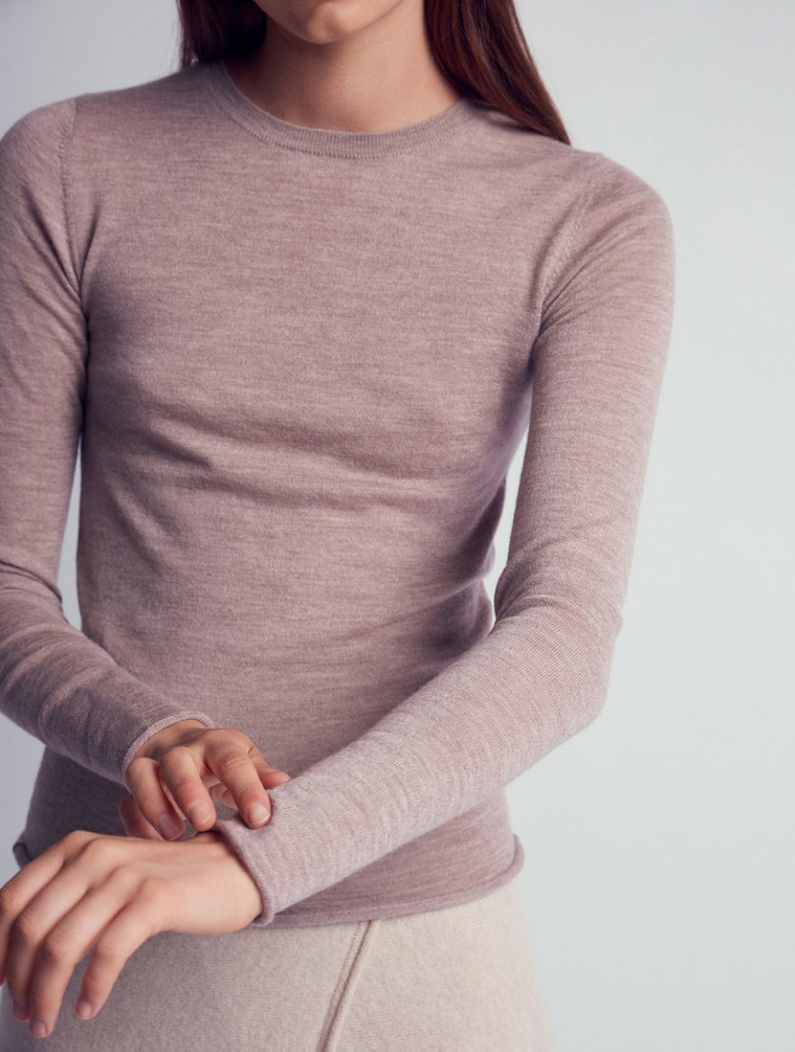 Long sleeve top knitted in impeccable soft extra fine cashmere from Inner Mongolia. Round neck with rolled edges. Fitted across the shoulders. Stretch fit for a second skin feel.