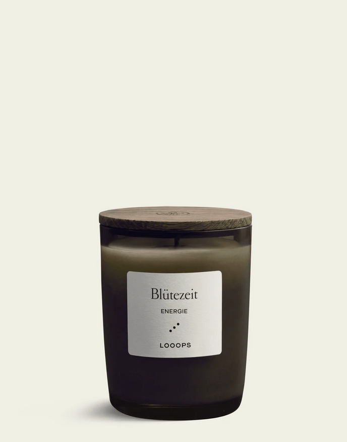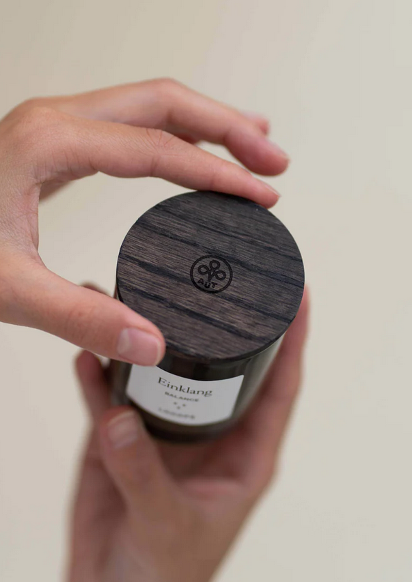 Natural scented candle made from vegetable wax and 100% pure natural essential oils. With stained oak lid. Handmade in Salzburg.