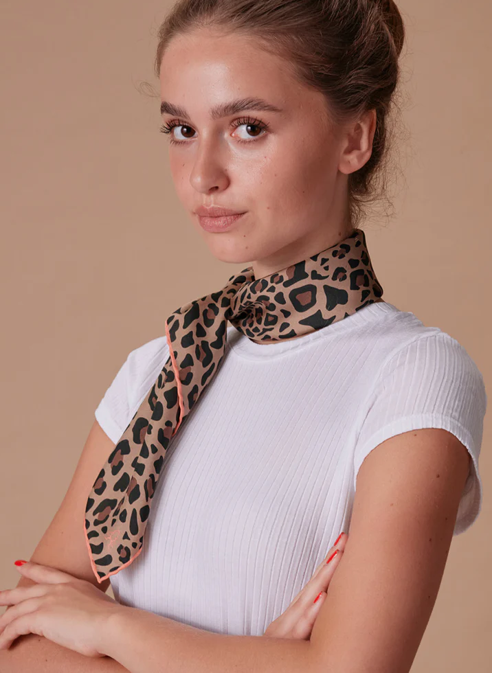 The highlight of the season and a must-have for fashion lovers. The sophisticated Leo print, interspersed with small hearts and a hand-drawn leopard, gives this scarf a playful touch. Playful in Silk – With Leo Atie combines striking patterns and strong colors to give every outfit that certain something and make a real style statement.