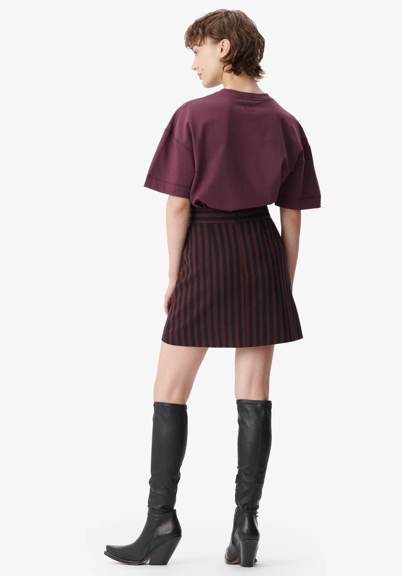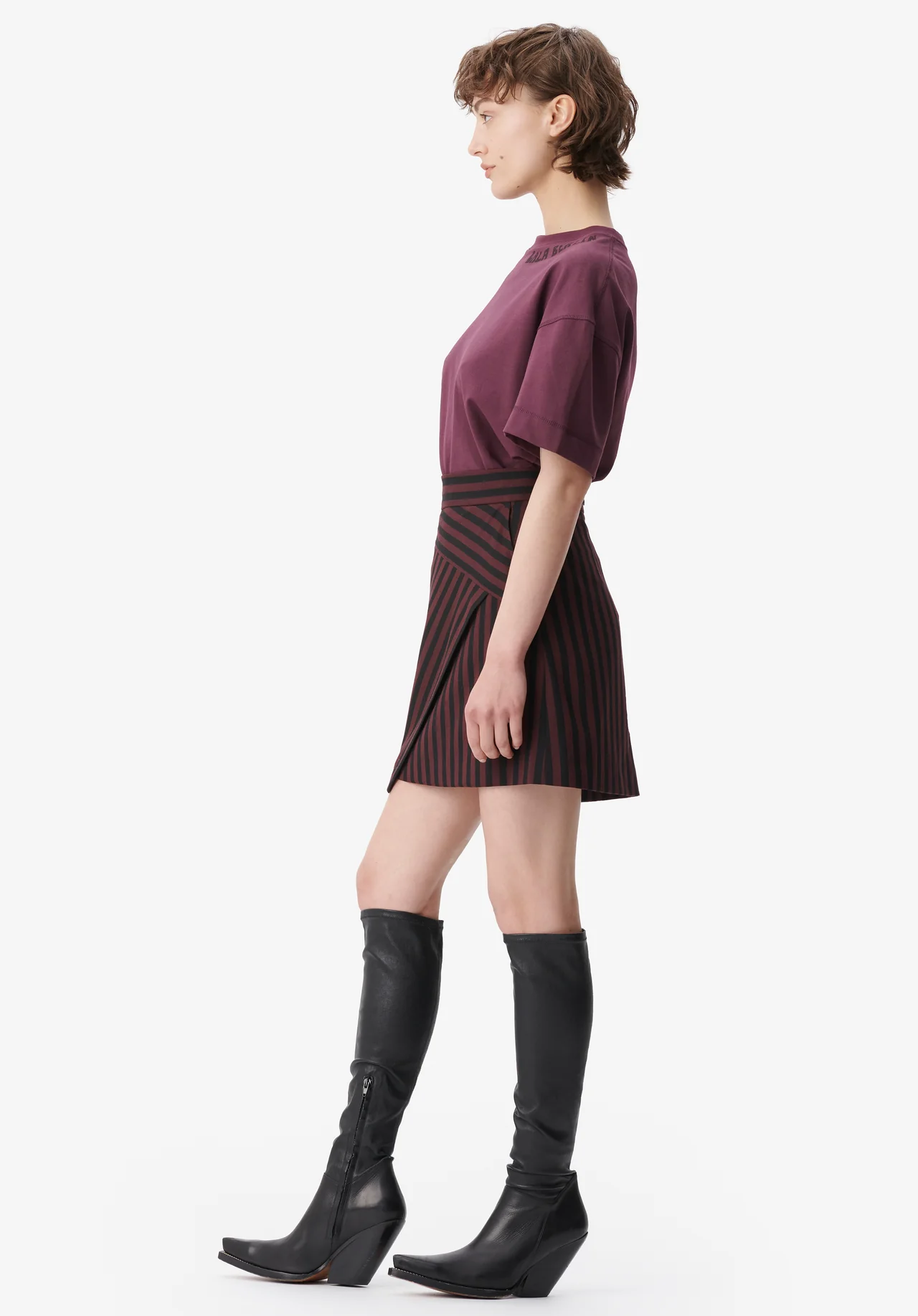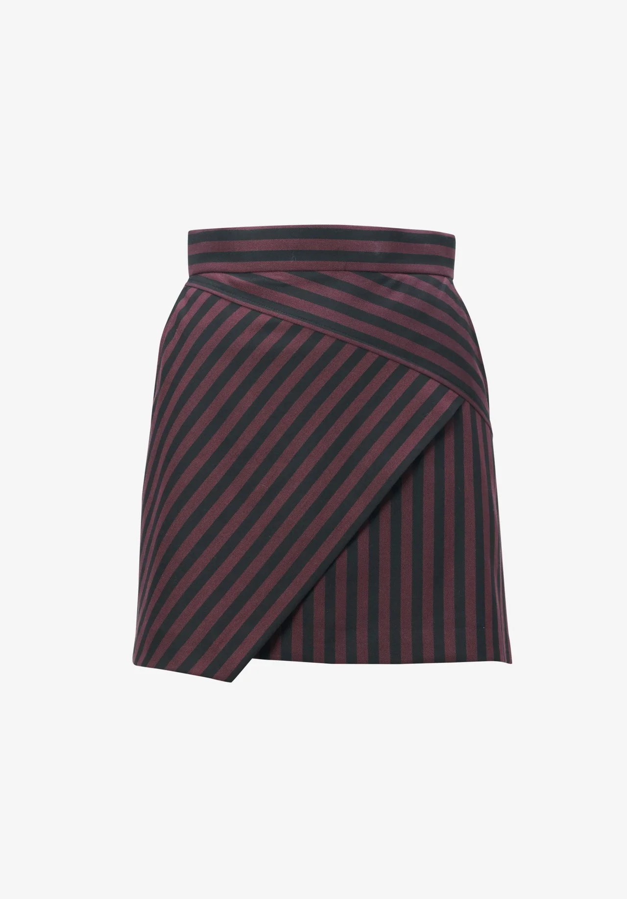 This stunning mini skirt features a wide stripe pattern enhanced by diagonal cutlines. The fabric is soft and lightweight, impeccably tailored in burgundy and black. The high waistline creates a flattering fit. For an extravagant suit look with a rebellious edge.