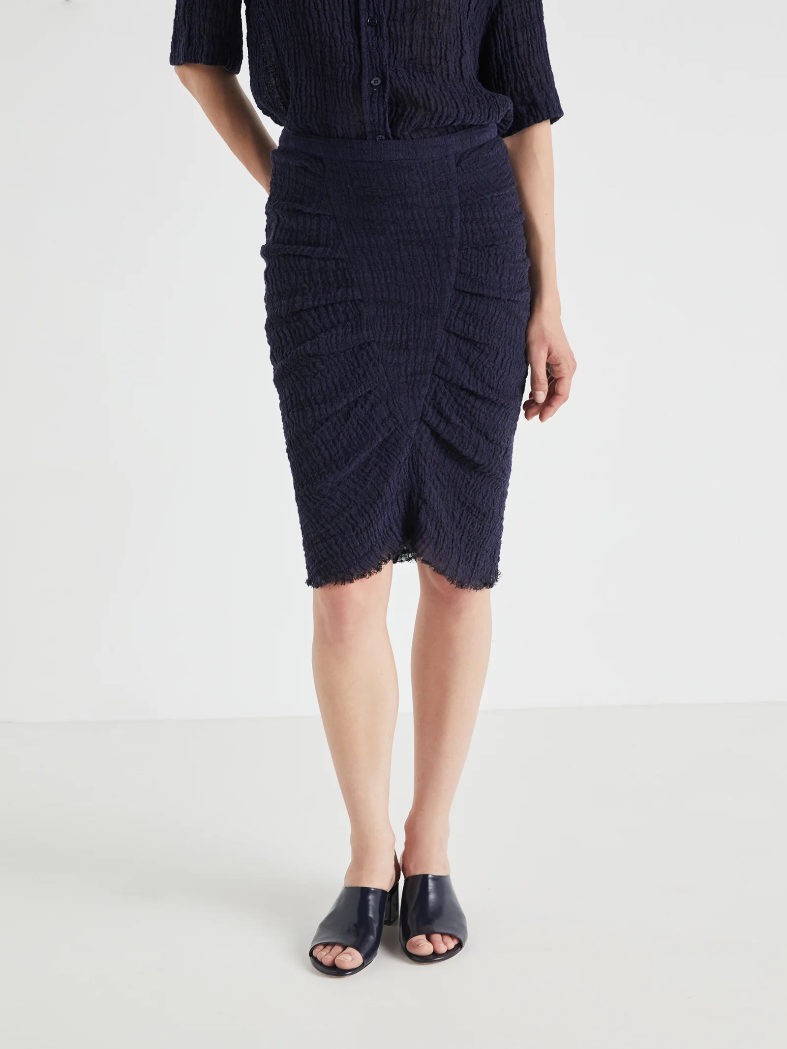 Fixed waistband and back zip closure.
