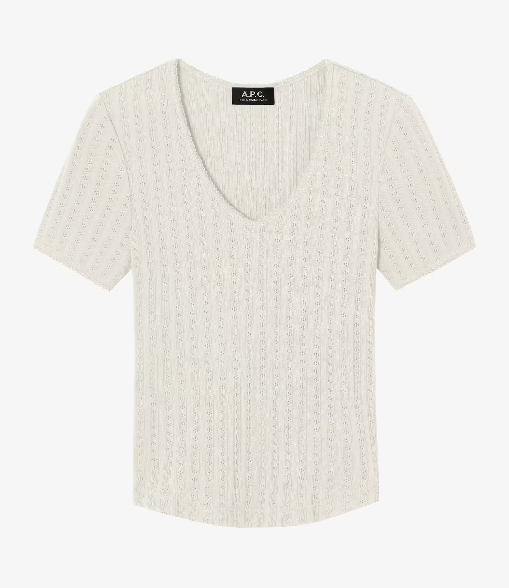 The Livia is a beautifully fitted T-shirt with a subtle pattern, featuring a V-neck and short sleeves.