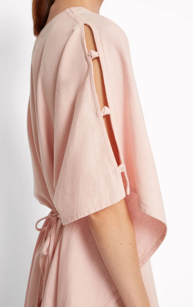 Hand-tied knot details on the sides of the sleeves and at the neckline