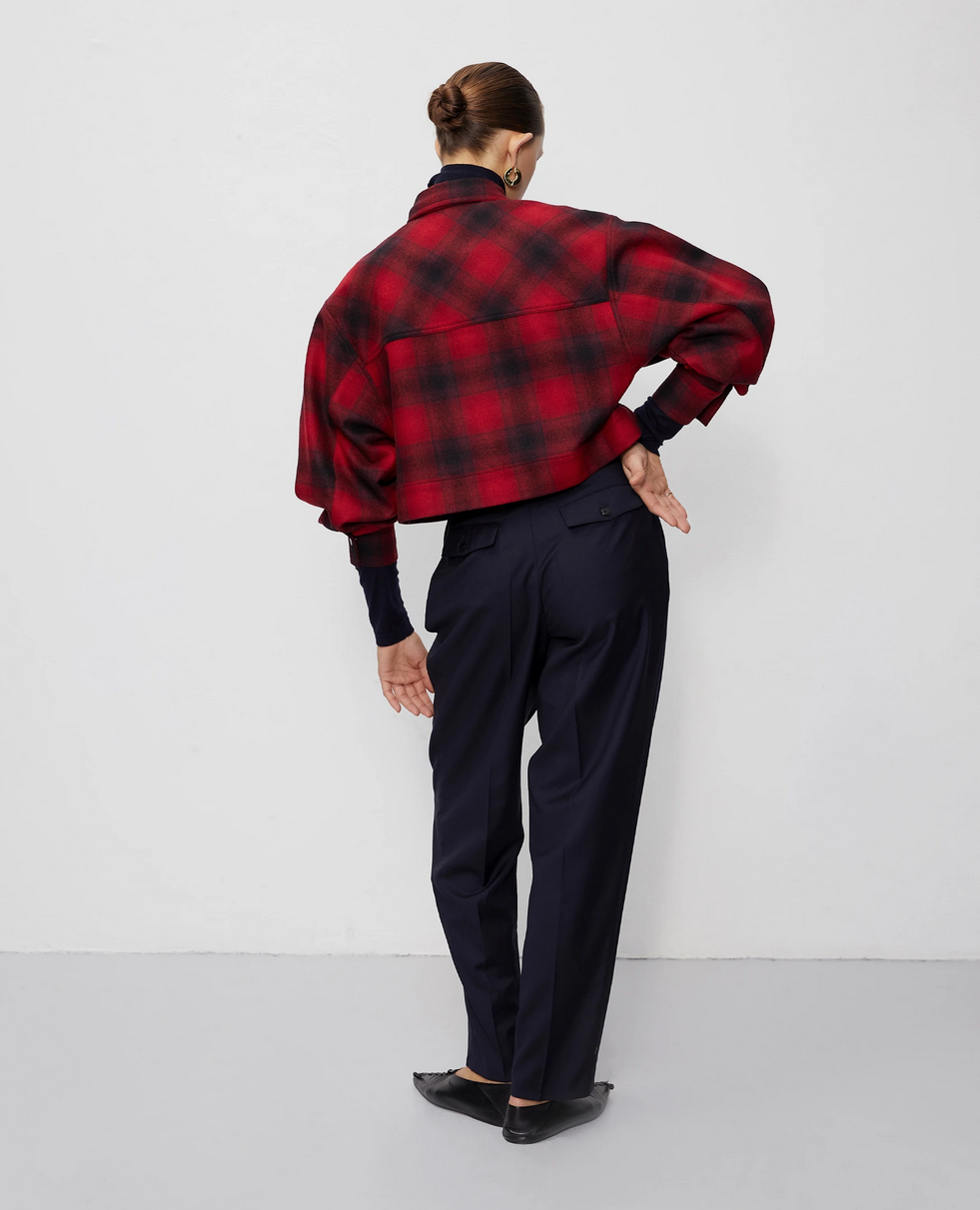High-waisted tailored men’s-style trousers with pleat detail and flap back pockets. Fabric is Italian Marlane Primatist super 100’s, a breathable, degradable virgin wool.