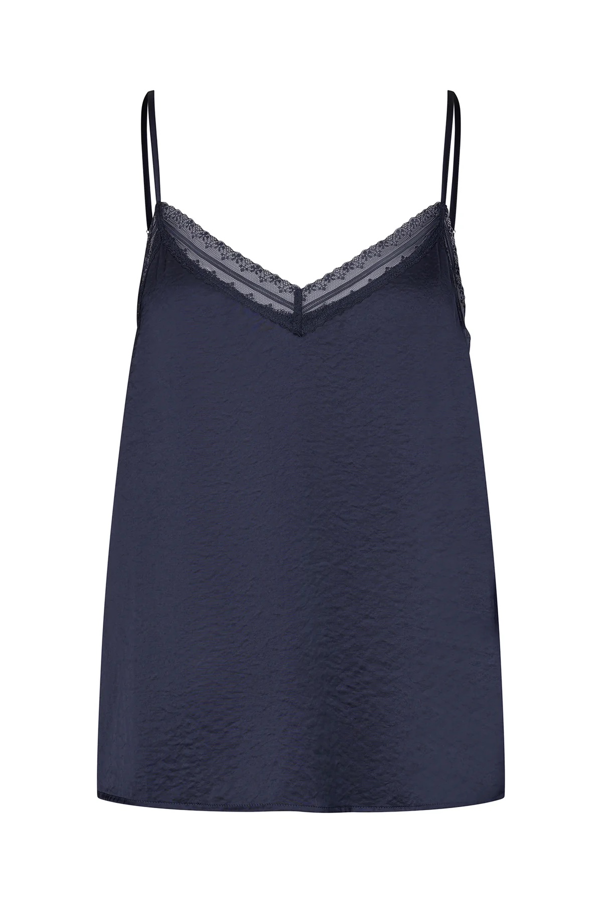 The Viane top from Lollys Laundry is a feminine top with elegant lace details and a beautiful, slightly shiny quality. It features a delicate V neckline with lace trim and slim straps, while the loose silhouette makes it light and comfortable to wear. The elastic at the back ensures a flexible fit, and the slightly heavier fabric drapes beautifully and creates elegant movement.