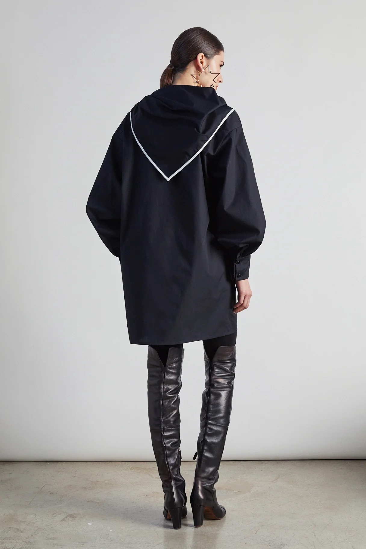 A sophisticated long-sleeved midi dress with asymmetric buttoning, an adjustable scarf, and contrast piping in white. Perfect for elevating any look, it comes in a classic premium black cotton.